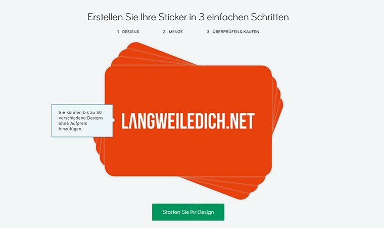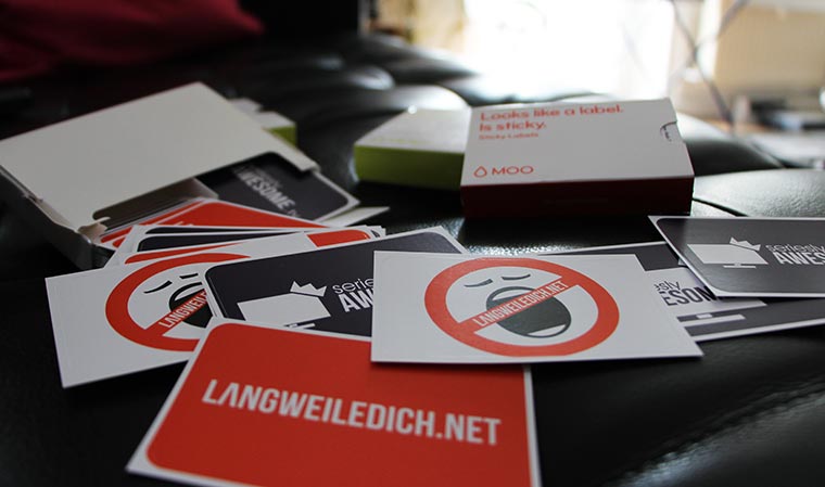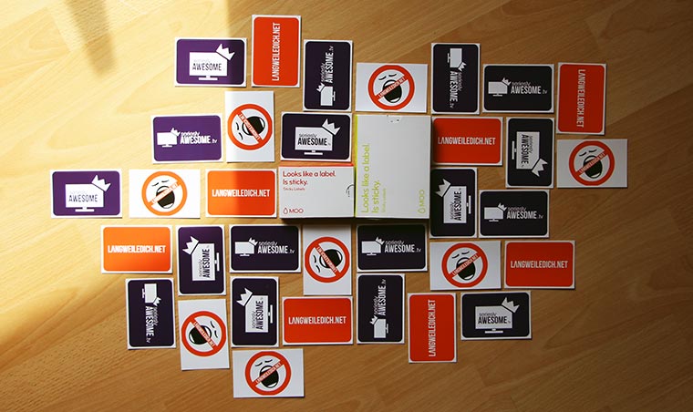 Ein großes Plus von MOO ist tatsächlich die Qualität. Die Druckerzeugnisse sind adäquat verpackt und die Sticker von guter Beschaffenheit. Keine superdünne Folie sondern angenehm anfühlendes und etwas dickeres Vinyl. Ich habe für diese Runde die rechteckigen Sticker ausprobiert. Die starten ab 19,99€ exkl. MwSt., was jetzt nicht gerade günstig ist, aber vor allem einen gigantischen Vorteil (neben der besagten Qualität hat): Printfinity. „Printwas?“ mag sich der ein oder andere fragen. Das bedeutet einfach nur, dass ihr quasi je Sticker ein anderes Motiv drucken lassen könnt. Wenn ihr wollt. Ich habe vier Motive mit LangweileDich.net- und seriesly AWESOME-Design eingestellt, die auf die entsprechende Gesamtmenge am Ende aufgeteilt wurden.
