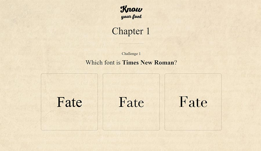 Ich liebe Typografie, bin aber ziemlich beschränkt, was die Namen von Schriftarten angeht. Ich weiß, was ich mag und gut finde, bin aber sehr vergesslich, bzw. nutze meist nur selektive Fonts aktiv im Alltag. Wer sich als richtigen Typo-Nerd bezeichnet, sollte mal Know Your Font ausprobieren. „The Typography Adventure“, wie es sich selbst beschreibt, gibt einem aber wenigstens ein paar Auswahlmöglichkeiten. Meist sind es ja eh die kleinen typischen Ausprägungen bei Einzelbuchstaben, die man sich einprägen muss…