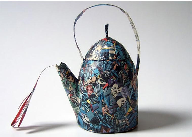 Die schwedische Künstlerin Cecilia Levy hat einen Weg gefunden, aus ausgedienten Büchern und Comics neue Kunst zu schaffen. Fernab von Wörtern und Fantasie, rein physisch in Form von kleinen Skulpturen. Aus Seiten werden Ebenen, die ein bisschen an Pappmaschee erinnern – nur natürlich viel detaillierter und feingliederiger verarbeitet, als mein Pferdekopf aus der Grundschule. So enstehen Tassen oder auch Schuhe aus eins vielgelesenen Papieren. Am besten gefällt mir die Comic-Kanne – bitte mehr Graphic Novels verarbeiten!