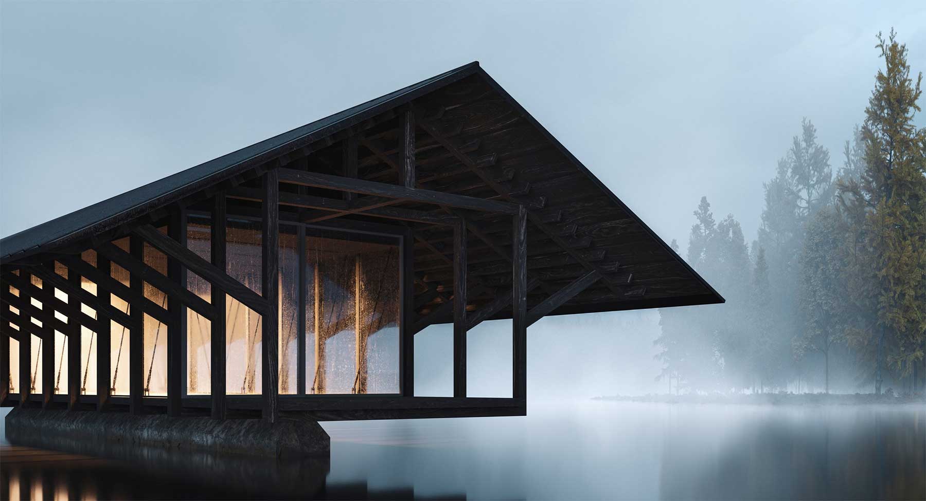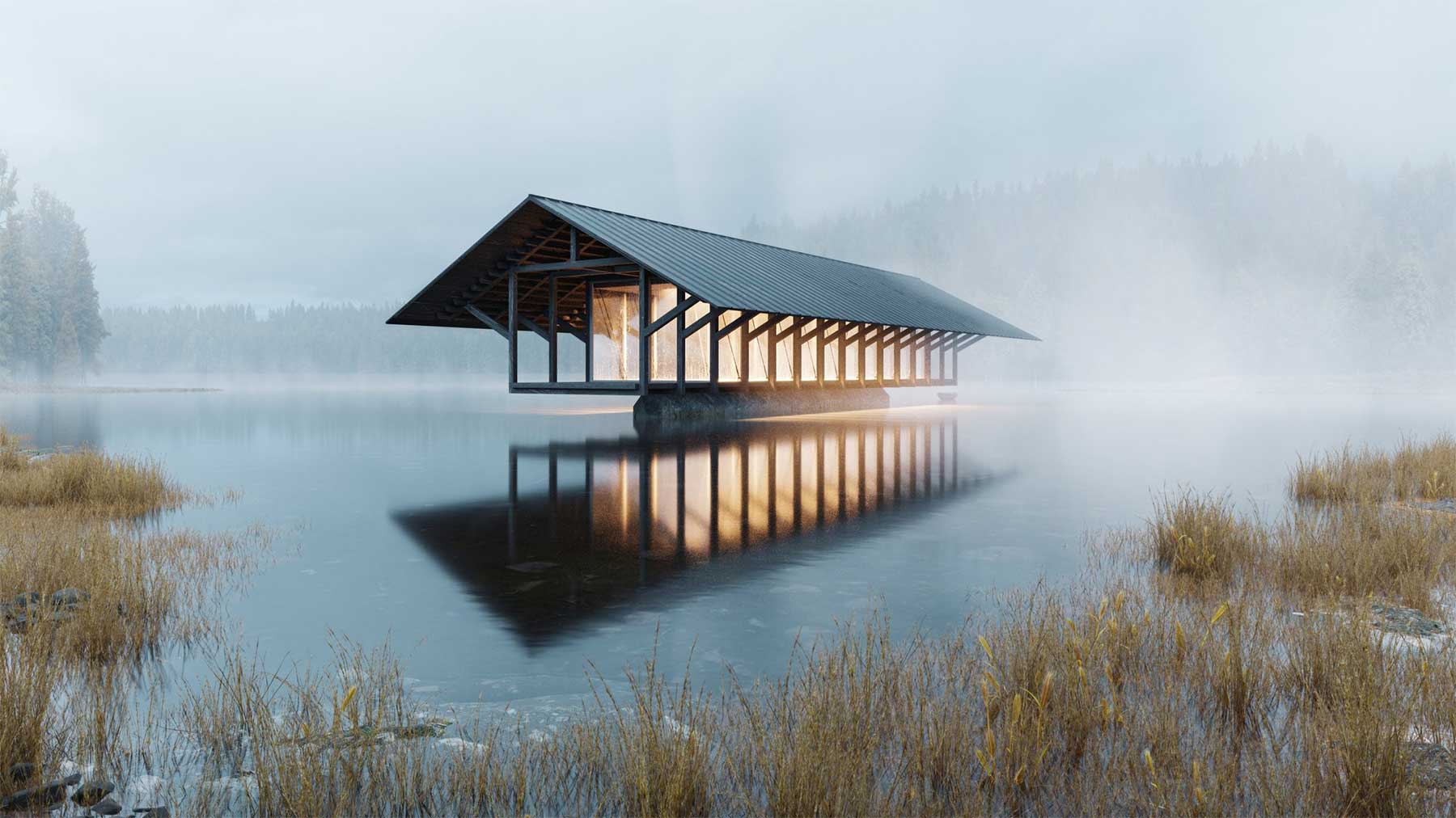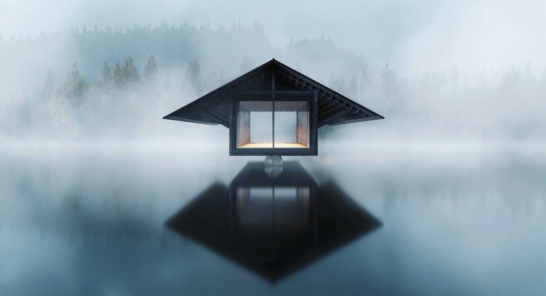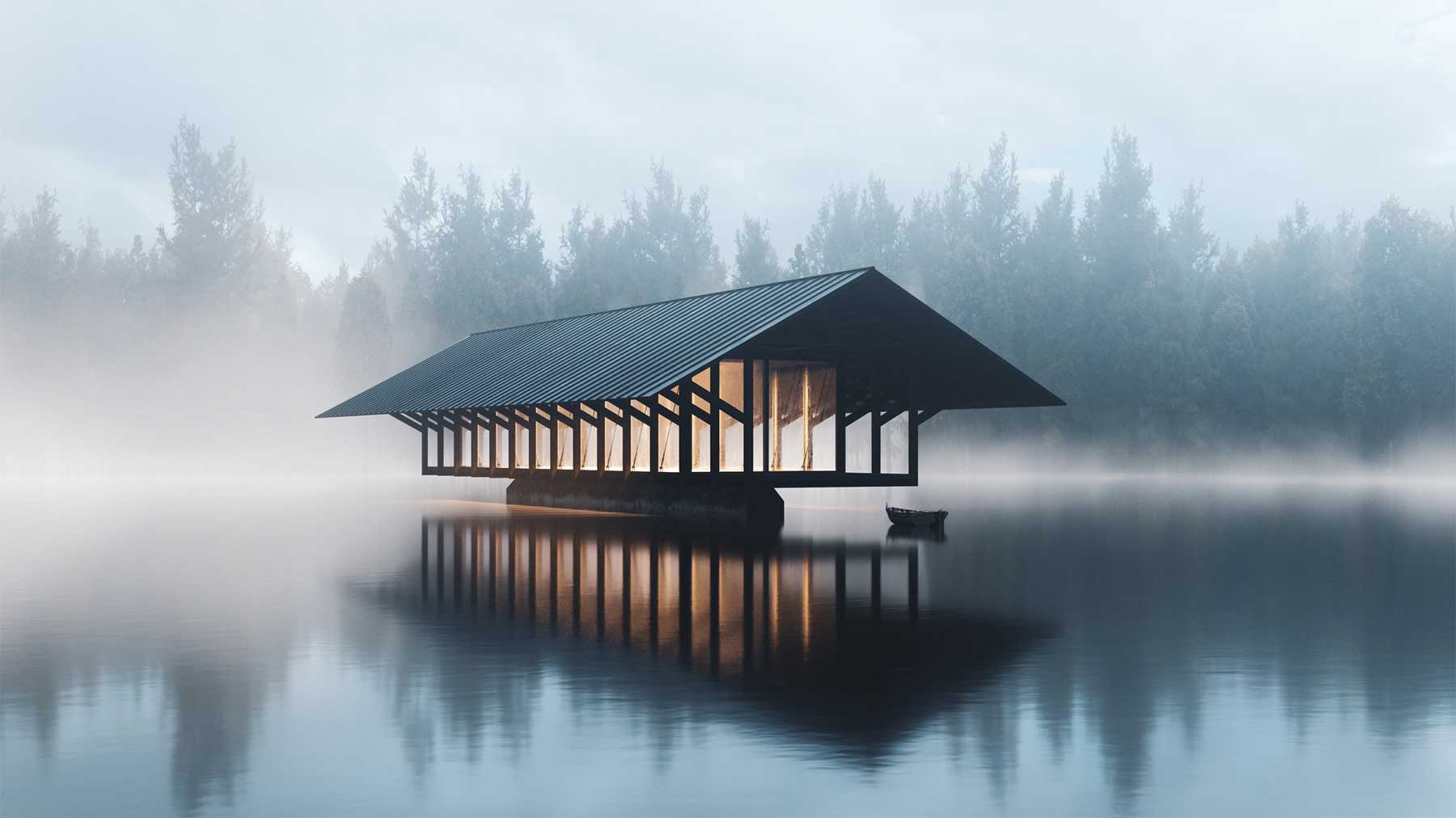 Peter Fox sang einst vom Haus am See, aber das ist sowas von 2008! Marc Thorpe und sein Design-Team haben ein Haus AUF einen See gepackt (zumindest gedanklich, denn noch ist der Bau nicht erfolgt und die Visuals hier lediglich aus dem Computer). Genauer gesagt ein Pavillon (eher ein Gebäudetyp denn ein Haus, ich weiß, aber lasst mir doch diese super-kreative Einleitung…) auf den Crystal Lake. Entsprechend trägt das Objekt auch den passenden Namen „Crystal Lake Pavilion“. Der ganz besondere Charme dieses architektonischen Designs erfolgt durch die Aufsetzung auf einen schmalen Steinlauf, der von Weitem suggeriert, das Objekt würde über der Wasseroberfläche schweben. Dann noch etwas Nebel, Dämmerung und Innenlicht, fertig ist die fotogene Location für wahlweise Traumhochzeitsfeiern, Horrorfilm-Settings oder alles dazwischen (manch eine Person stellt die ersten zwei Optionen ja eh bereits gleich).