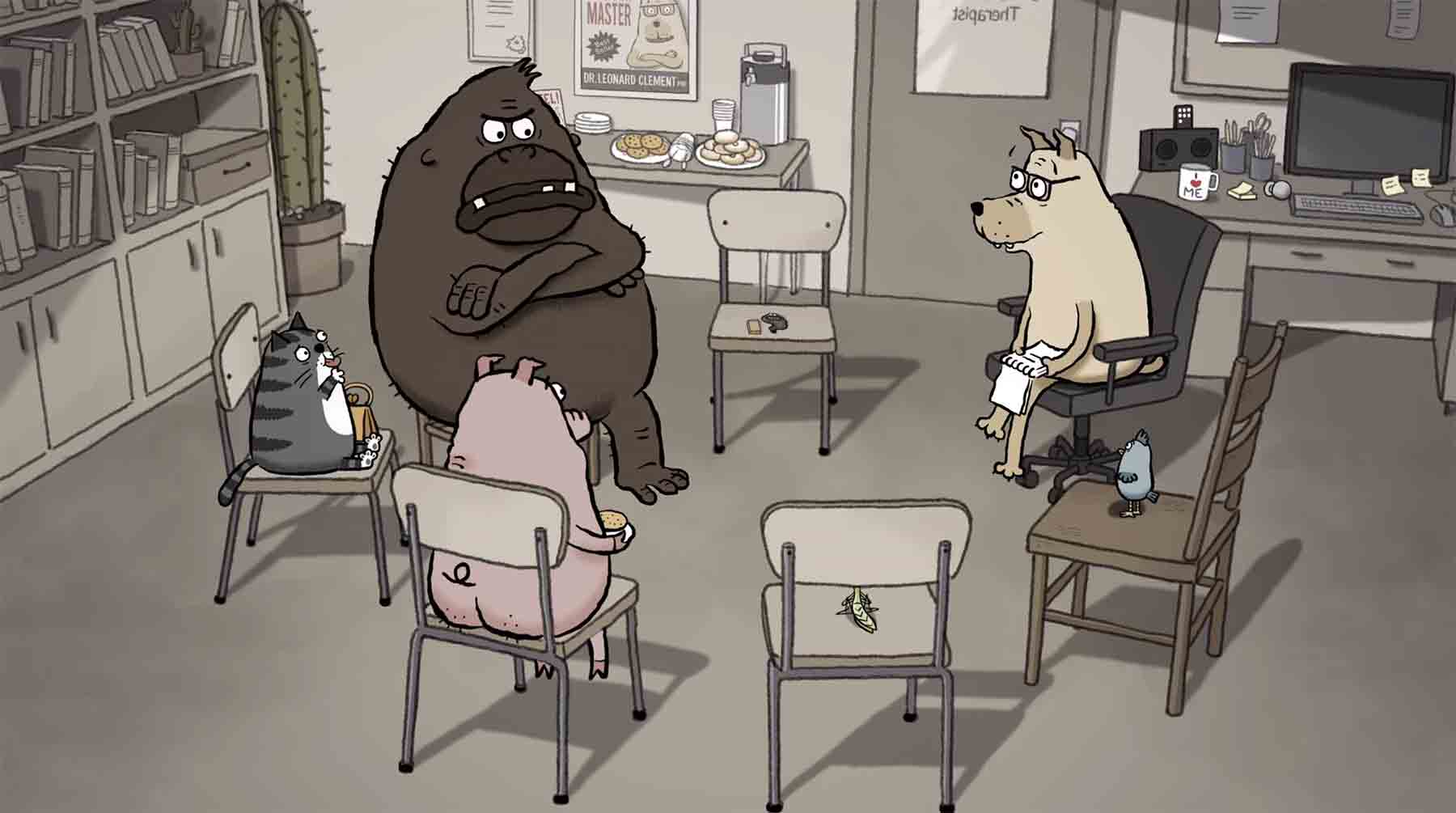 Eine Katze, ein Hund, ein Blutegel, eine Gottesanbeterin, ein Schwein, ein Gorilla und ein Vogel. Nein, das ist sind nicht die Tiere, die ich beim letzten Zoo-Spaziergang entdeckt habe, sondern alle Teilnehmer der etwas anderen Selbsthilfegruppe im animierten Kurzfilm „Animal Behaviour“. Der wurde von Alison Snowden und David Fine umgesetzt und weiß mit vielen tierischen wie selbsthilfegruppigen Vorurteilen zu spielen.