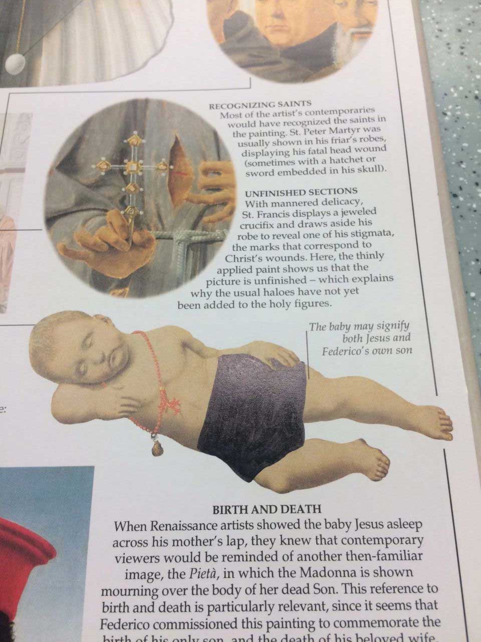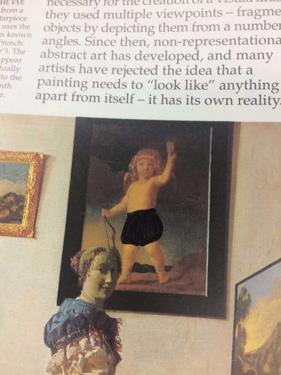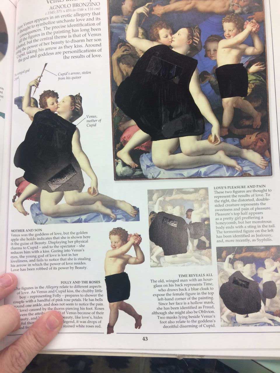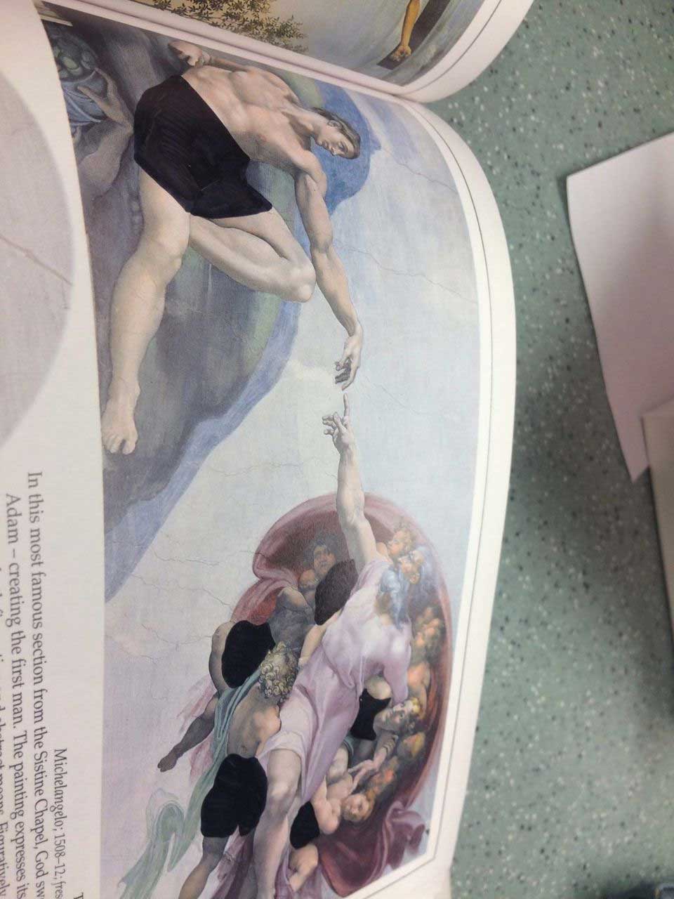 Zensur ist ja an sich nicht zu 100% verkehrt. Wenn zum Beispiel Minderjährige vor schockierenden Inhalten oder die Privatsphäre von Personen geschützt werden müssen – da macht ein bisschen Verpixelung oder ein schwarzer Balken schon einmal Sinn und es ist besser, es ein Mal zu viel als zu wenig zu machen. Aber man kann es eben auch sehr übertreiben, zumindest aus moderner Sicht. Aber wie so vieles auf der Welt ist auch das Empfinden anstößiger Inhalte eine relative Sache. Die „Pensacola Christian College“ in Florida hat bei einem Buch über klassische Kunst etwas öfter zum Schwarzstift gegriffen und vielen Figuren schwarze Unterhosen verpasst. imgur-User scopecreepstudio hat einige Bilder hochgeladen, die uns zeigen, wie weit die Zensur geht, und wie wenig Kunst dann wirklich noch überbleibt.