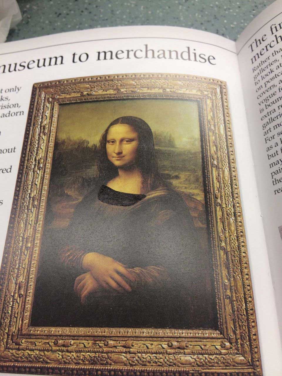 „Fine art books censored for ’nudity‘ in a fundamentalist Baptist college library. Yes that is the Mona Lisa.“