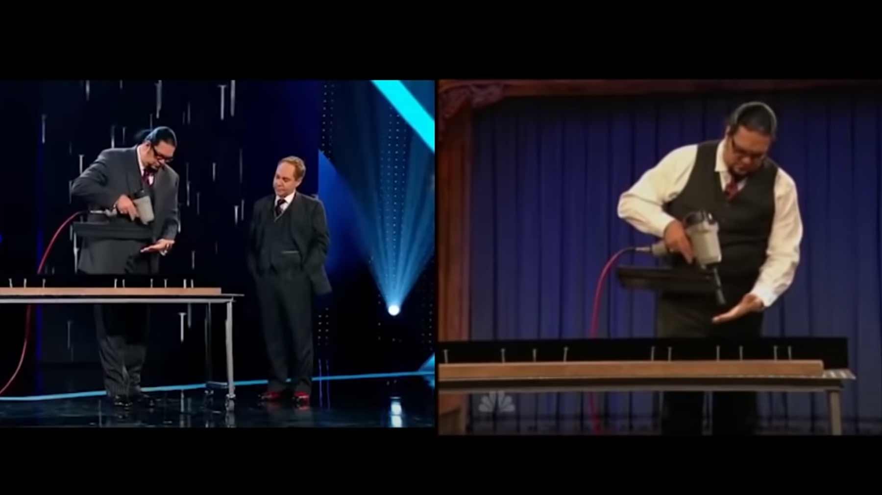 Als Zauberer musst du deine Tricks natürlich tausendfach üben, vor allem, wenn du vor einem Millionenpublikum performst, wie es das TV-bekannte Magie-Duo „Penn & Teller“ oftmals macht. Da spielen sich natürlich gewisse Routinen ein und alles muss perfekt sitzen. Tellerputzer war so fasziniert von der Professionalität der beiden, dass er ein und denselben Zaubertrick aus unterschiedlichen Aufzeichnungen nebeneinander gesetzt hat. Zwar leider etwas verstückelt, aber man kann durchaus erkennen, wie on point der Ablauf ist. Teilweise Wort für Wort.