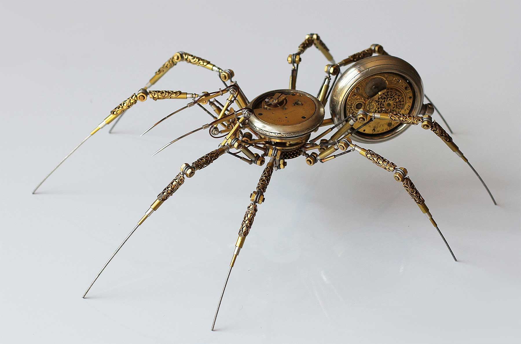 Der in Budapest lebende Peter Szucsy ist wöchentlich auf Flohmärkten unterwegs, um kleine alte Schätze zu bergen. Taschenuhren beispielsweise. Deren Teile seziert er dann, um sie umzufunktionieren. Zu Beinchen oder anderen Körperteilen, resultierend in Steampunk-Spinnen-Skulpturen, die eine ganz besondere Ausstrahlung besitzen. Mit gefällt vor allem die Inszenierung samt Spinnennetz im goldenen Bilderrahmen. Die kleine Taschenuhrenkrabbe gefällt mir aber beinahe noch besser…
