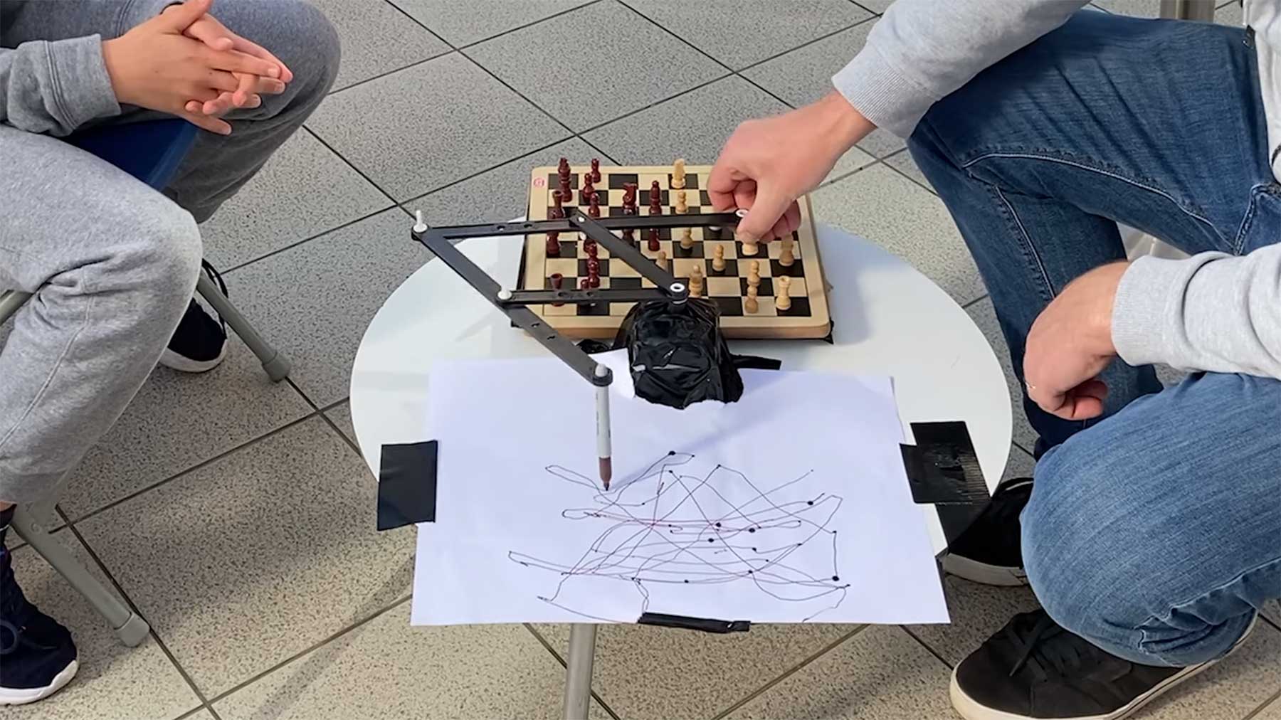 Das hat was von dem Etch-a-Sketch-Roboter, den ich neulich verbloggt hatte. antnhec hat eine „Play station“ erstellt, an der Schachspielende mit ihren Bewegungen eine Apparatur in Gang setzen, die einen Stift auf Papier bewegt. So erhält jede Partie ihre ganz eigene abstrakte Zusammenfassung in Form eines Kritzelbildes. Nette Idee.