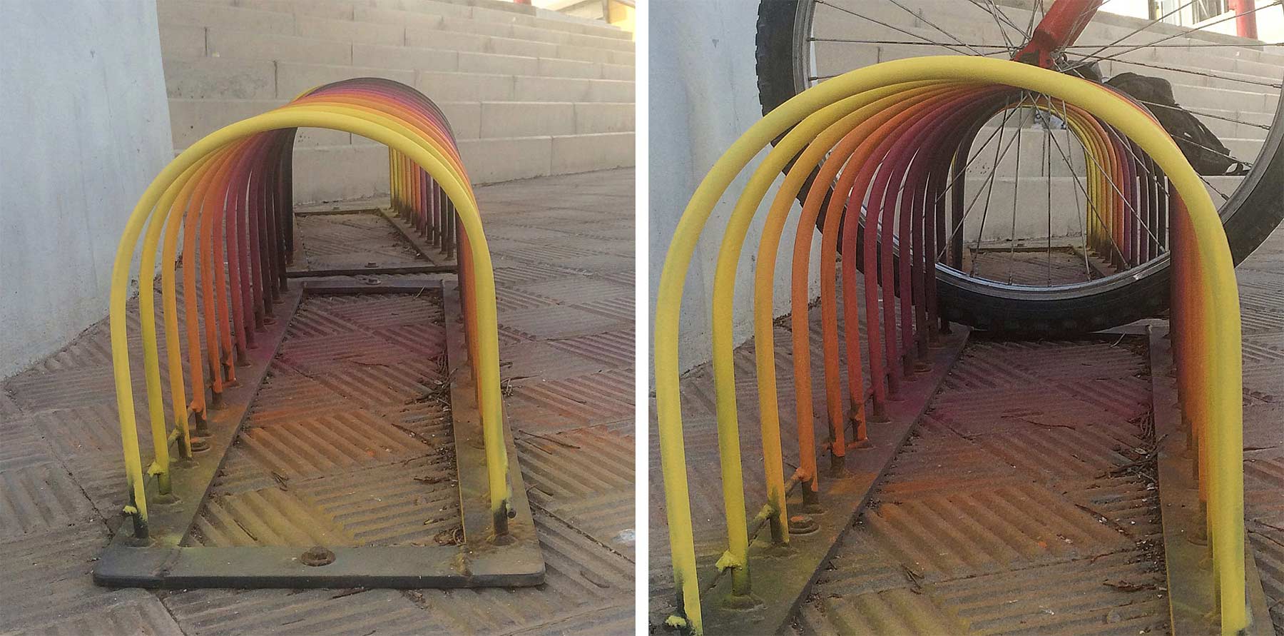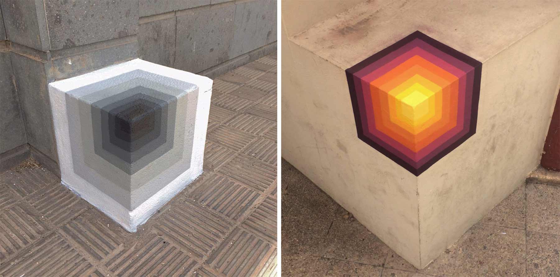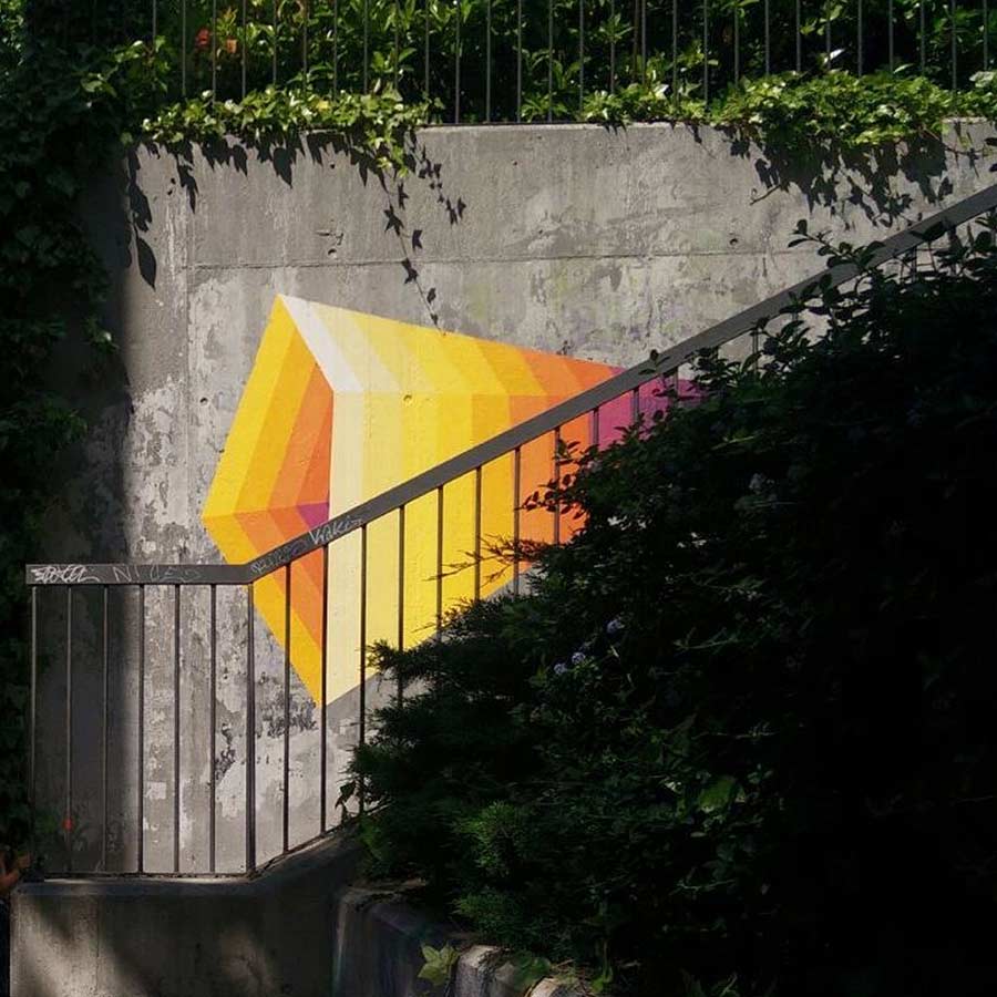 Was wie eine extreme Kennzeichnungsnummer für eine Glühbirne klingt, ist coole Street Art aus Spanien. E1000 besticht in seinen Arbeiten durch eine enorm saubere und durchdachte Ausarbeitung. Klare Formen und Linien, die je nach Unter- und Hintergrund aufgetragen wurde, stets im gleichen gelb-orange-lila anmutenden Farbspektrum behaftet.