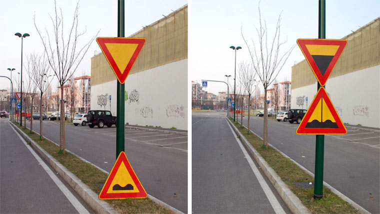Vielleicht habt ihr das ein oder andere der folgenden Bilder bereits in einer alten Bilderparade gesehen. Jetzt weiß ich endlich, von wem die stammen! Nämlich von Street Artist Fra.Biancoshock auf Mailand. Der hat einen ganz kreativen Blick auf die Dinge und schafft es regelmäßig, seine Mitbürger zum Schmunzeln zu bringen. Vor allem die Luftpolstersache – die hatte ich mir schon als LangweileDich.net-Guerilla-Werbeaktion ausgeguckt…