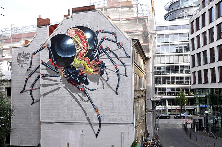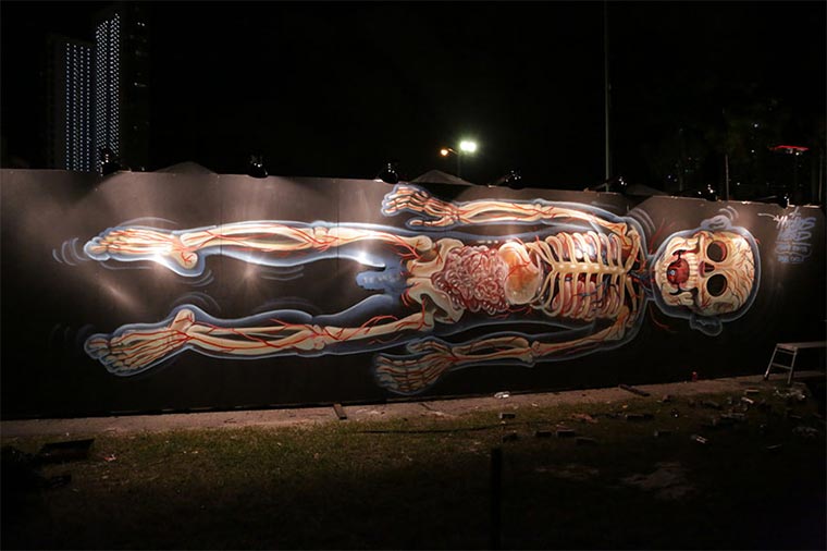 Der aus Wien stammender Street Artist Nychos gibt uns Einblicke in die Anatomie berühmter Popkultur-Figuren und Lebewesen. Ob Meerjungfrau, Ninja Turtles oder Mensch. Alle bekommen einen Röntgenblick oder eine Matrjoschka-Kur verpasst. Visuell sicherlich nicht die entspanntesten und ruhigsten Motive, die man sich vorstellen kann, aber ungemein gut gemacht.