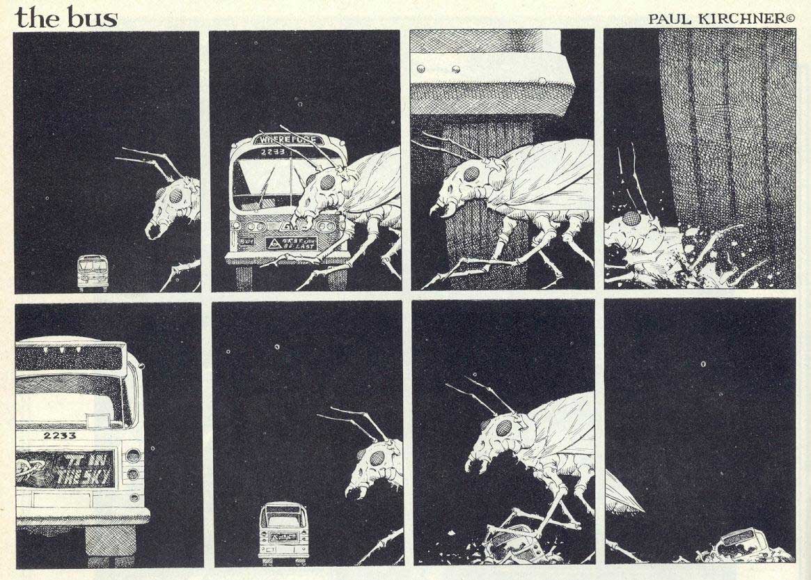 Paul Kirchner ist ein in Deutschland geborener und in die USA ausgewanderter Comiczeichner, der bereits für die „New York Times“ und das „Wall Street Journal“ tätig war. In den Achtziger Jahren hat er etliche originelle und vor allem ins Surreale abdriftende Comicstrips über einen langweilig anmutenden Bus gemacht. Diese gibt es gesammelt im Buch „Bus“ (Partnerlink) zu lesen, hier ein paar beispielhafte Strips.