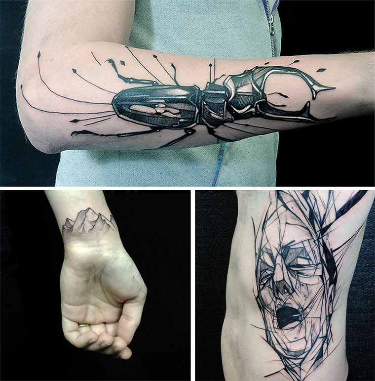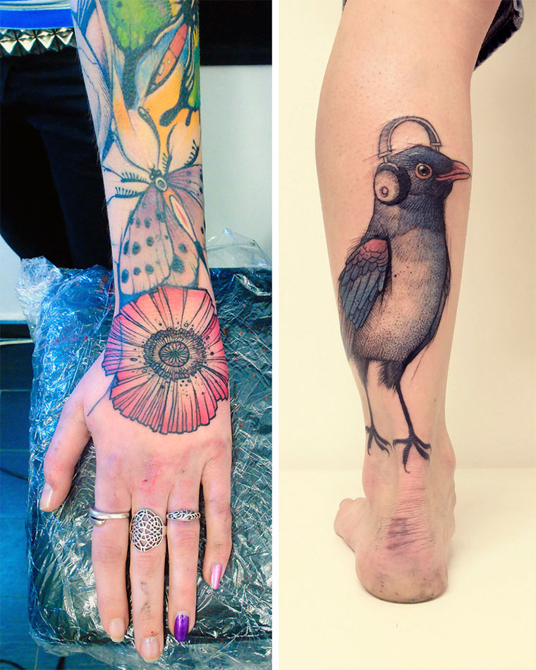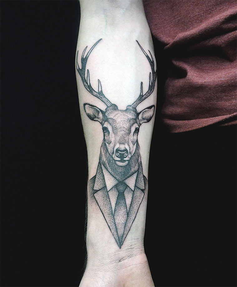 Illustrator Jan Mráz arbeitet auch im Tattoo-Studio Bobek Tattoo in Prag. Er erstellt sehr einzigartige und abwechslungsreiche Designs, die man schon einmal auf der Haut tragen kann. Ob einem in zwanzig Jahren jedoch noch ein großer Hirsch im Anzug auf dem Unterarm gefällt – ich weiß ja nicht. Schön anzuschauen sind die Motive aber allemal!