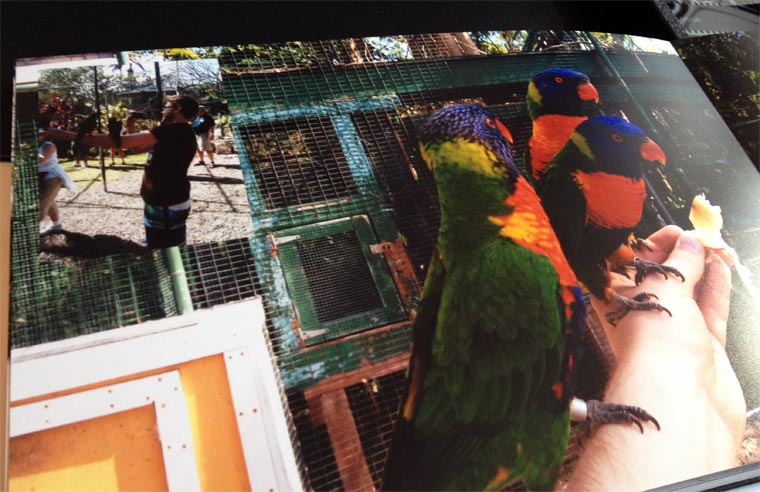 Die Möglichkeit, mehrere Bilder auf eine Seite zu packen, finde ich auch gut. Collagen, etc. lassen sich so fix im Programm erstellen und es muss nicht erst Photoshop herhalten, bzw. die Originaldateien verändert werden. Hier bspw. ich beim Fotografieren von Papageien und letztlich im Vergleich das entstandene Foto. Knüller.