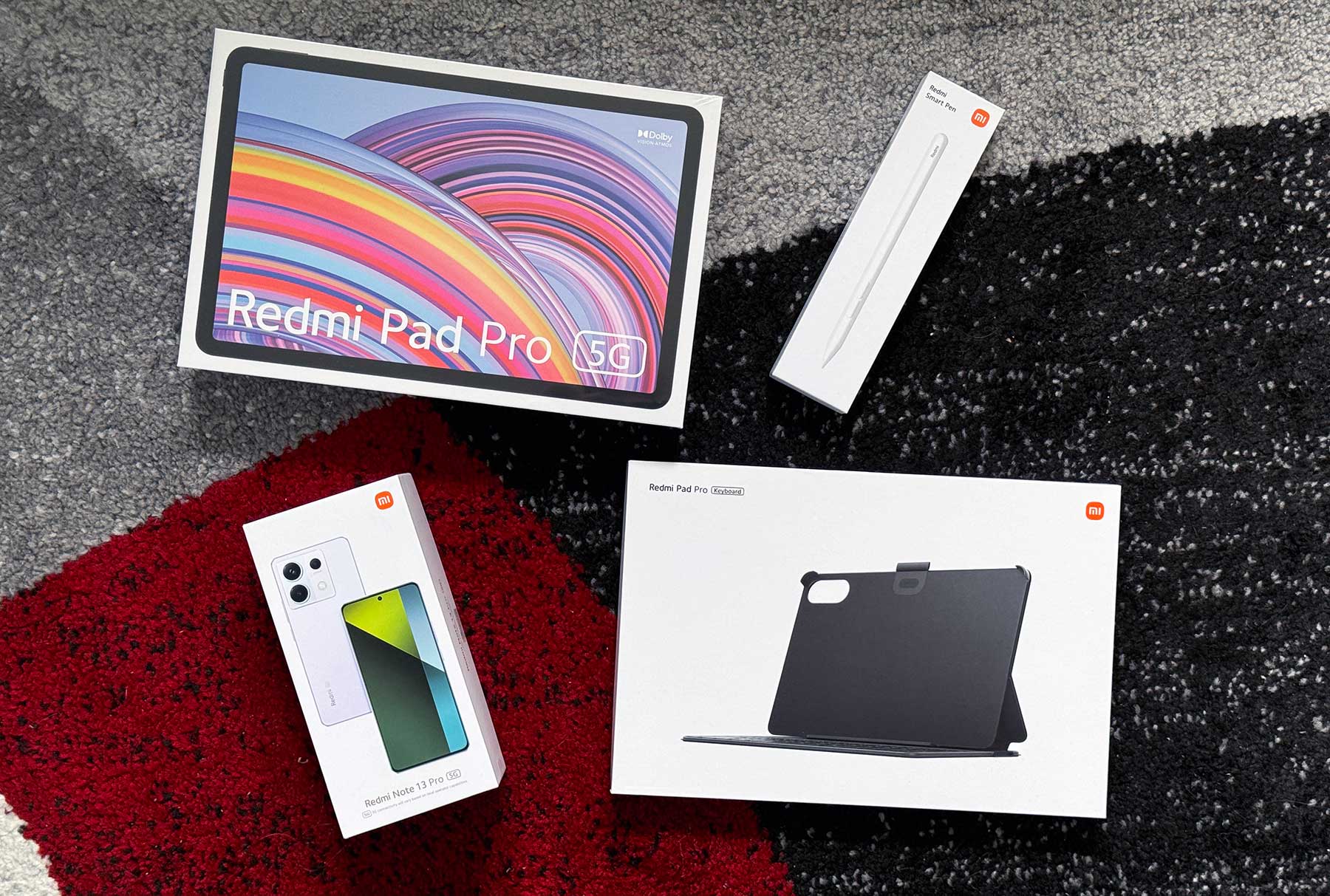 Neben dem Redmi Pad Pro 5G habe ich auch passendes Zubehör erhalten, um den Test umfassend durchführen zu können. So lagen die Redmi Pad Pro Tastatur (mit praktischer Hüllen-Funktion), ein Redmi Smart Pen sowie ein Redmi Note 13 Pro 5G Android-Smartphone aus dem Hause Xiaomi bei.