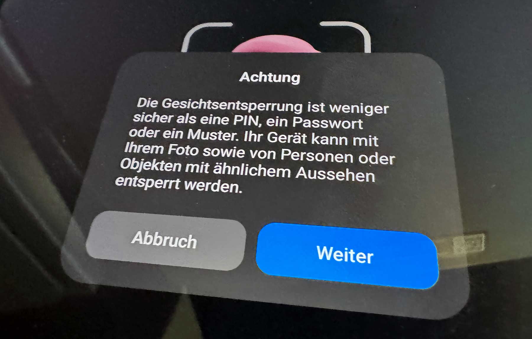 Wie man es von modernen Tablets und Smartphones gewohnt ist, wird man beim ersten Starten des Gerätes durch den Prozess der initialen Einrichtung gelotst. Das funktioniert soweit auch einwandfrei. Etwas schmunzeln musste ich bei der KI-gestützten Gesichtserkennung, deren Einrichtung lediglich auf Basis eines einzelnen Fotos basiert und auch entsprechend wenig Sicherheit bietet, wie der eingeblendete Warnhinweis betont:
