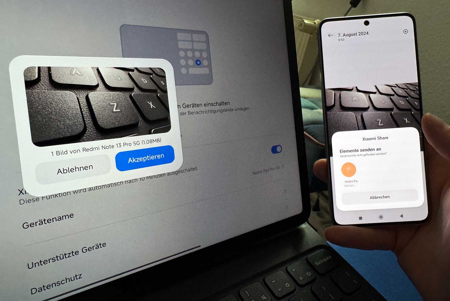 Das mit Android 14 bestückte Betriebssystem Xiaomi HyperOS weiß vor allem in Verbindung mit einem entsprechenden Smartphone sämtliche Konnektivitäts-Vorteile auszuspielen. So lässt sich bei verknüpftem Account in Windeseile Content vom Tablet auf das Telefon und umgekehrt transferieren. Zum Beispiel kann ich in Windesweile ein 200-Megapixel(!)-Foto mittels „Xiaomi Share“ transferieren.
