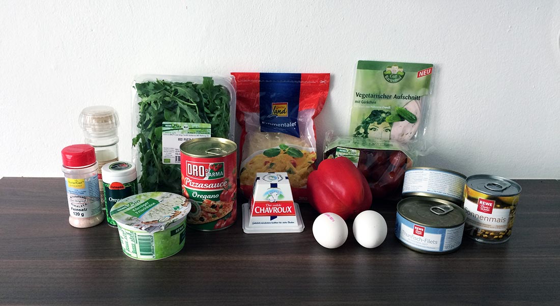 Wichtig ist eigentlich nur der Kram für den Teig, der Rest ist halt Pizza – sprich: total individuell handhabbar, wie ihr Pizza eben mögt. Hier die Auflistung der Dinge, die ich im Kücheneinsatz hatte.