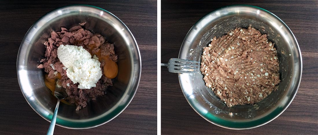 1. Thunfischdose öffnen, abtropfen lassen und den letzten Schweiß kraftvoll heraus pressen. Muss so trocken sein wie die afrikanische Steppe.