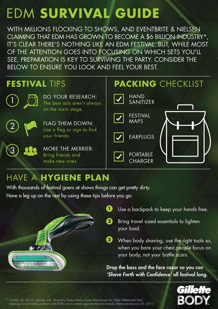 Dass Gillette gerade vor allem mit dem BODY enorm musikalisch unterwegs ist, hatte ich ja bereits beim Synchronschwimm-Battle der Mutanten-DJs gezeigt. Jetzt wird es ganz konkret, denn Gillette ist dieses Jahr auch mit eigenem Stand auf dem Splash! vertreten, wo Mann sich entspannt rasieren kann. Dazu gibt es einige nützliche Tipps in Form einer Infografik, was man keinesfalls vergessen darf, wenn man auch auf dem Festival drei Tage frisch ausschauen möchte.