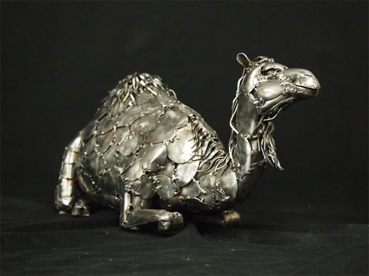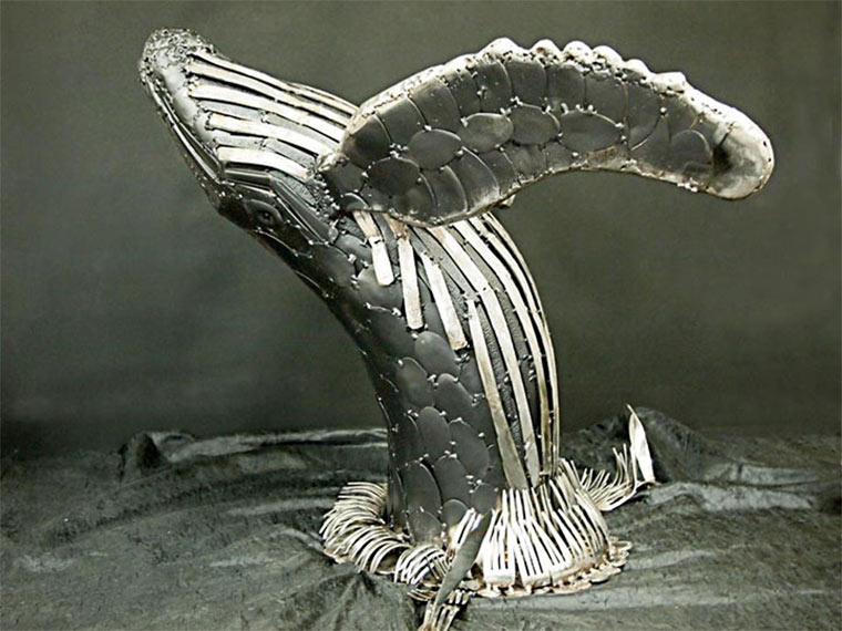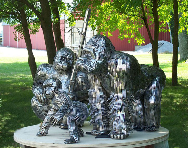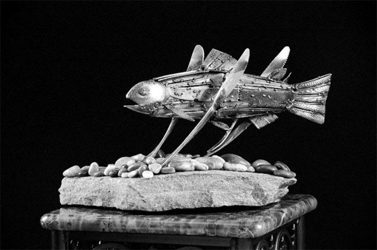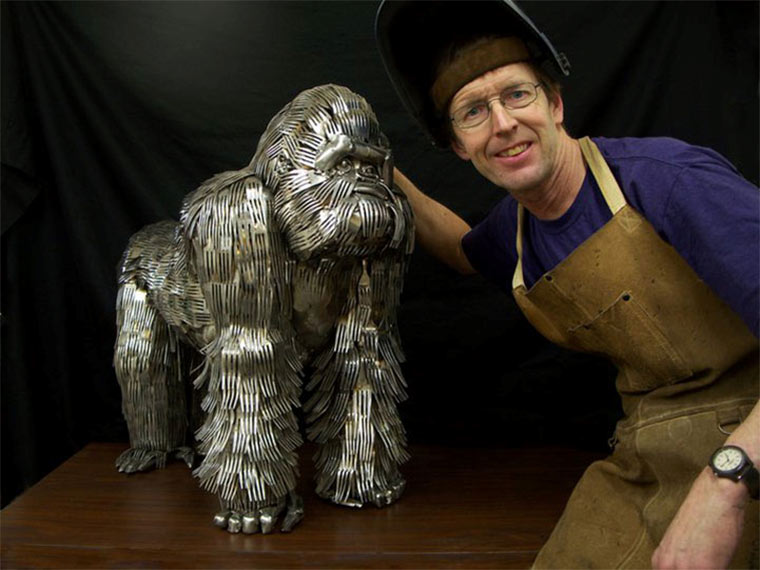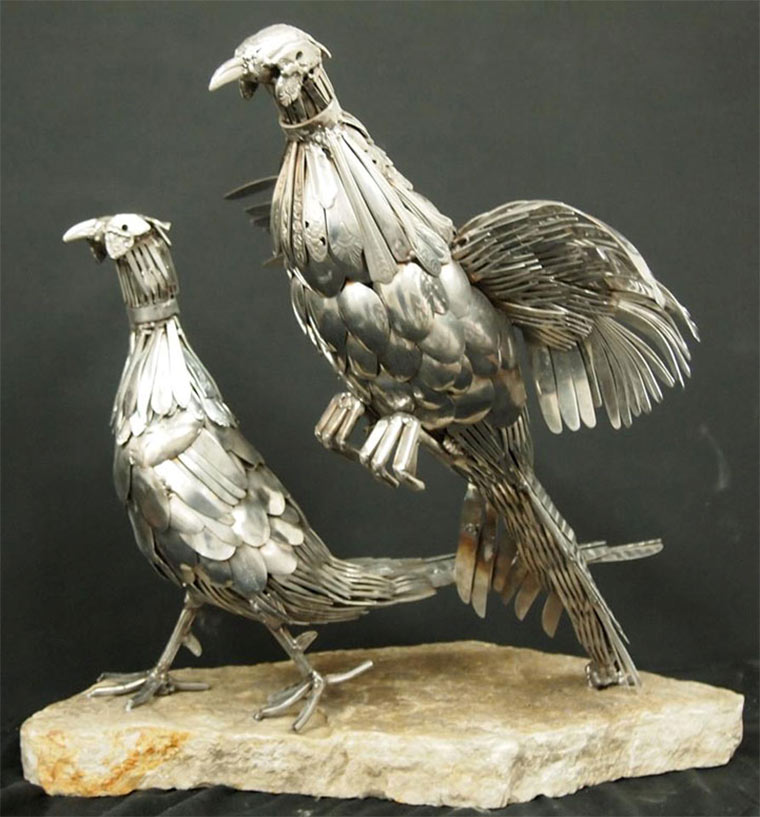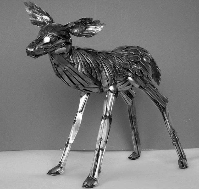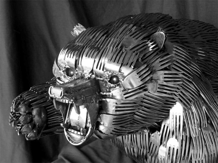 Vor einer Weile hatte ich euch die beeindruckende metallerne Löwenskulptur von Selçuk Yılmaz gezeigt. Die Arbeiten von Gary Hovey aus Ohio gehen in eine ganz ähnliche Richtung. Es sind ebenso Tierskulpturen aus metallernen Gegenständen. Nur eben etwas kleiner. Die Tiere bestehen fast ausschließlich aus Besteck. Gabeln, Messer und Löffel sind gekonnt verarbeitet worden, so dass teils erstaunlich detailreiche Tiere entstehen.