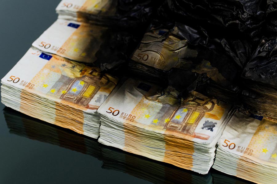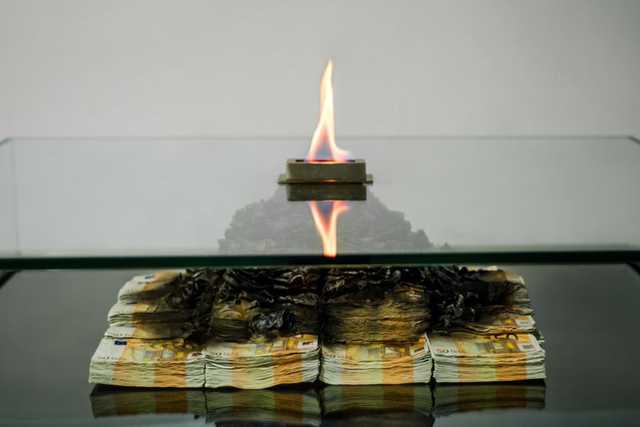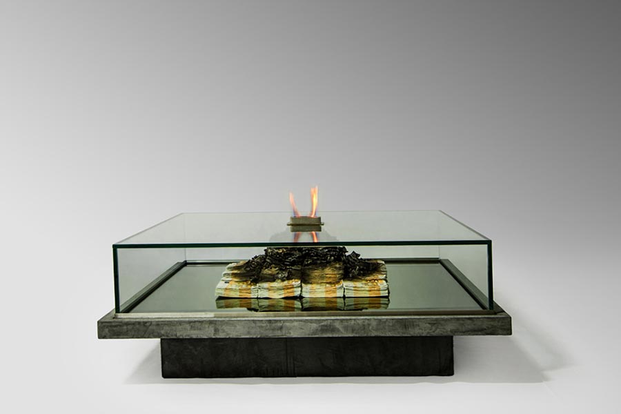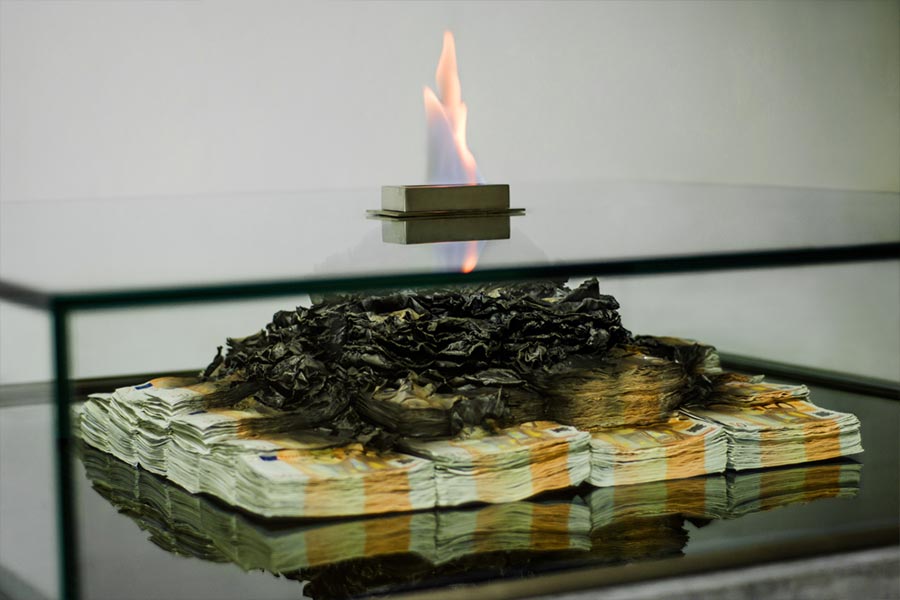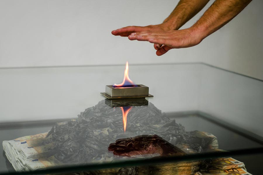 Ein ganzes Stück Gesellschaftskritik steckt hinter diesem Tisch. „Too Much? II“ heißt das Kapitel, in dem das Amarist Studio gemeinsam mit Künstler Alejandro Monge die Fuffis nicht durch den Club wirft, sondern wortwörtlich verbrennt. Okay, eigentlich brennt nur ein kleiner Tischkamin über einem scheinbar angekokelten Haufen 50 Euro-Scheinen, aber die Message bleibt. Geldverbrennung wo man hin schaut, obwohl es so viel Armut gibt auf der Welt.