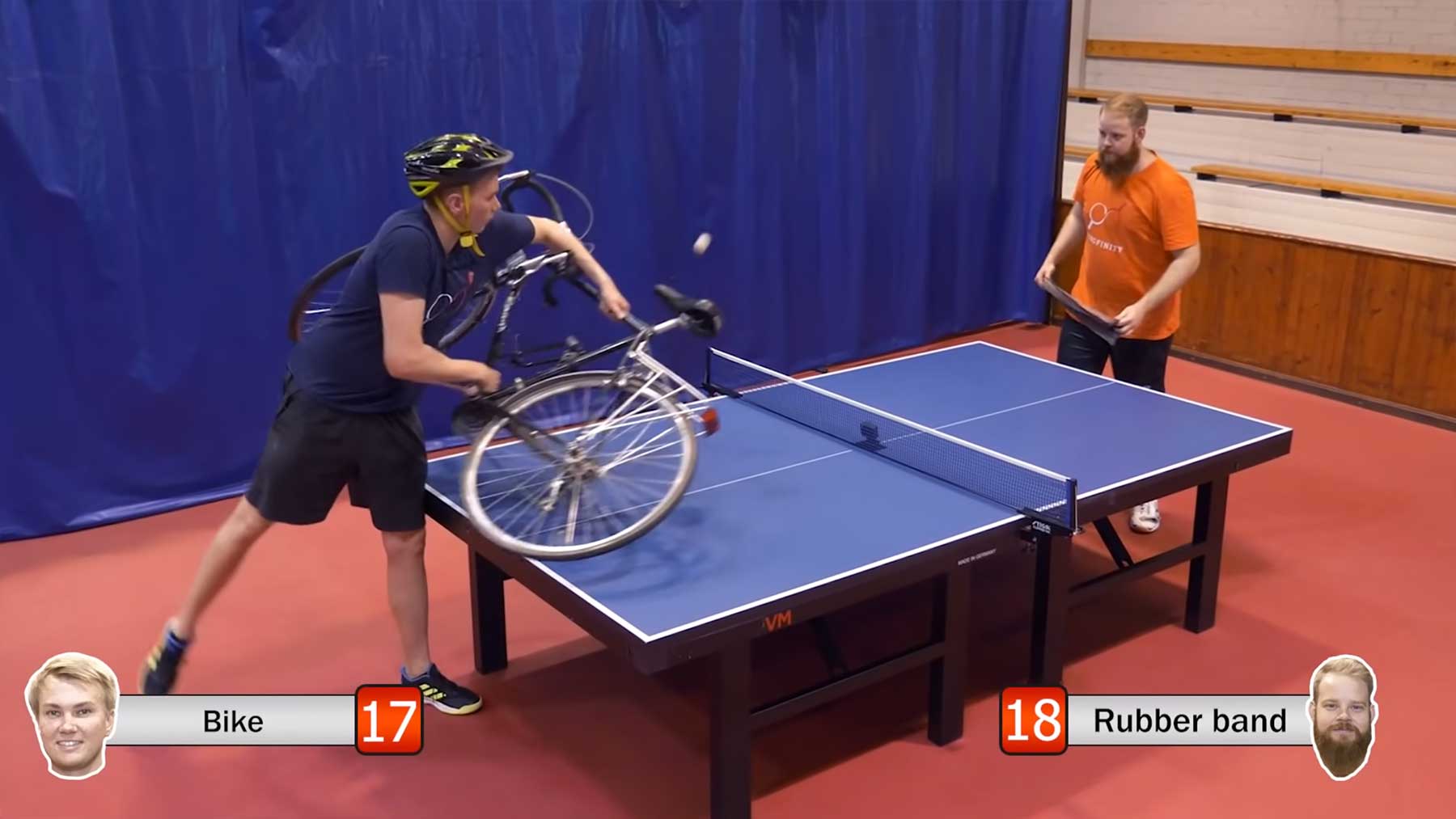 „A ping pong match to 21 points with 21 different sports equipment! Who will win: Emil or Otto?“