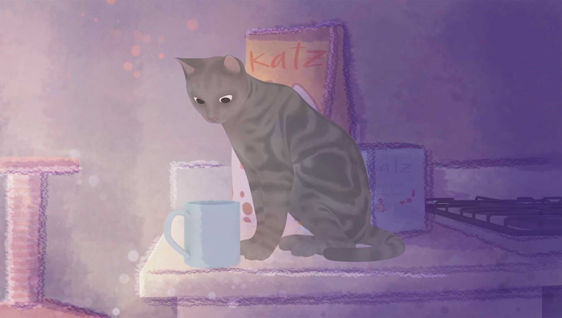 Dass es sich bei „Love Me Please“ lediglich um einen im Rahmen eines Studiums entstandenen Kurzfilm handelt, merkt man ihm an einigen Stellen an. Sei es der etwas willkürlich wirkende Soundtrack oder der (manchmal auch nicht ganz fehlerfrei wirkende) Misch-Masch aus 3D- und analog wirkender Grafik-Elemente. Dennoch weiß die an der UCA Farnham animierte Geschichte von Richard Yige Dai und Lillian Atkins vor allem das zu schaffen, was viele noch so tolle Animations-Künstler eben nicht hinbekommen: persönlichen Bezug. Denn auch wenn ich noch nie selbst eine Katze hatte, so habe ich bereits um die Anerkennung so einiger kämpfen „dürfen“ und weiß aus Erzählungen und nicht zuletzt diesem Internetz-Dingens hier, wie eigenbrödlerisch und engstirnig die Stubentiger oftmals sind.