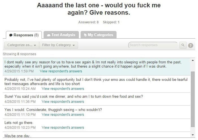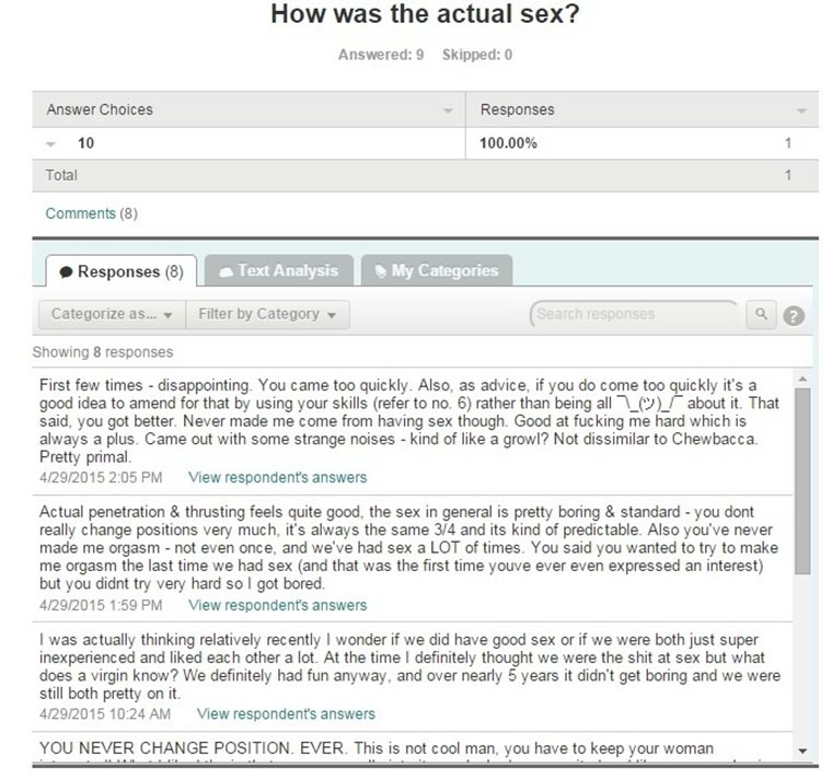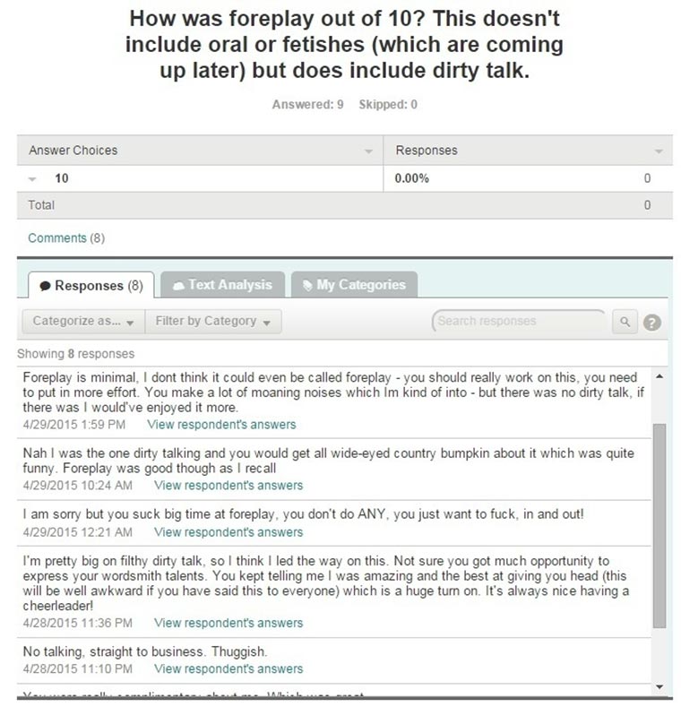 Die Ergebnisse sind durchaus unterhaltsam. Dabei wurden seine Eigenschaften und Talente in acht Kategorien unterteilt: Verführung, Küssen, Aussehen, Vorspiel, Cunnilingus, Der eigentliche Sex, Anderes Zeug und Würdest du noch mal?