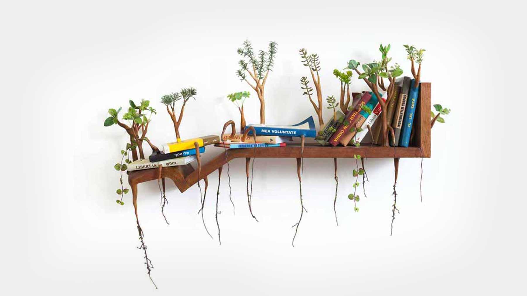 Vor ziemlich genau vier Jahren hatte ich bereits hier im Blog über die Arbeiten von Camille Kachani berichtet. Kürzlich sind mir die Wurzel-schlagenden Holzgegenstände erneut unter gekommen, also dachte ich, mal ein kleines Update mit neueren Arbeiten des in Brasilien lebenden Künstlers zu veröffentlichen. Vor allem Mobiliar ist noch dazu gekommen, aber auch das ein oder andere Buch hat jetzt einen Ast aus sich heraus recken…