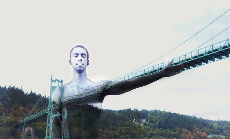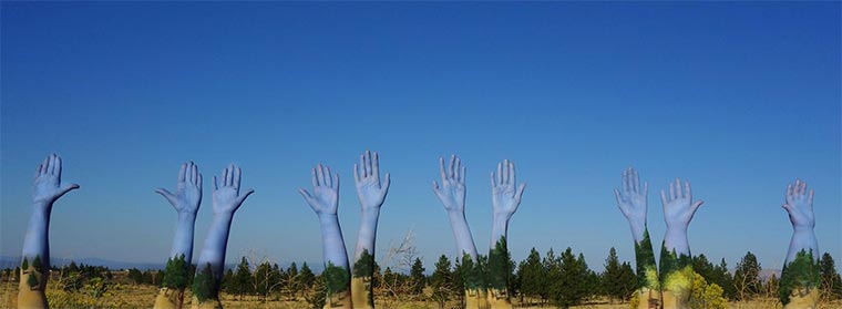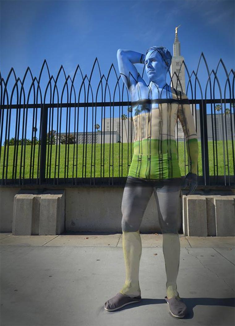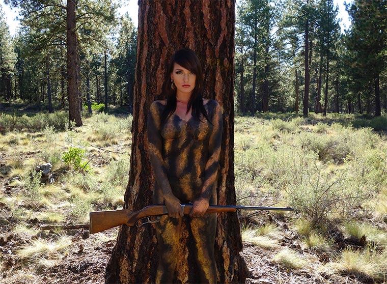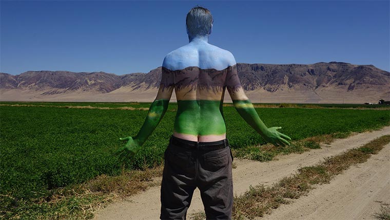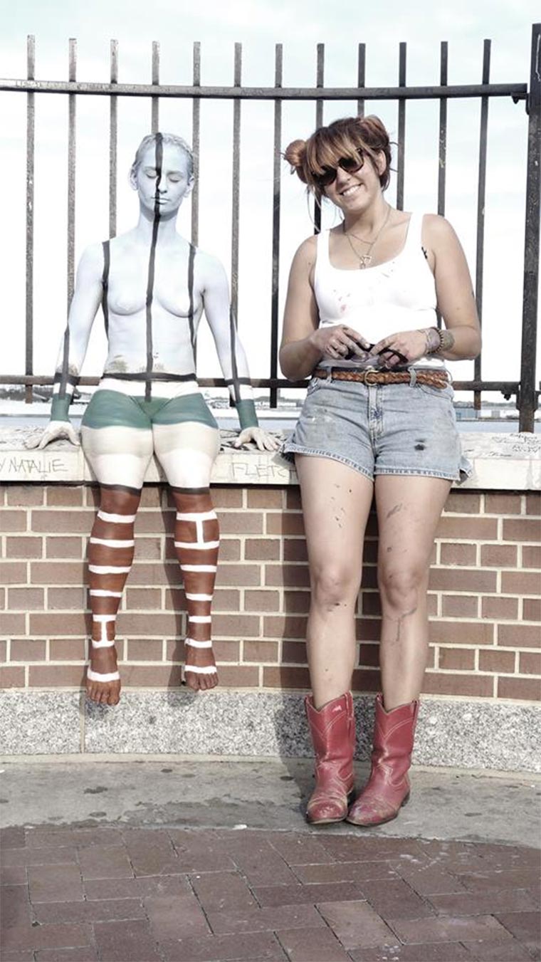 Natalie Fletcher ist natürlich nicht die Erste, die Personen derart mit Farbe bekleistert, dass sie sich in den Hintergrund integrieren (bspw. zuvor hier: Emma Hack). Aber die amerikanische Künstlerin aus Oregon malt eben nicht nur Tapetenmuster nach sondern weiß ihre Models in der großen weiten Natur zu inszenieren. Und dabei wird auch gerne mal perspektivisch mit dem Hintergrund gespielt anstatt einfach nur langweilig in der Gegend herum zu stehen.