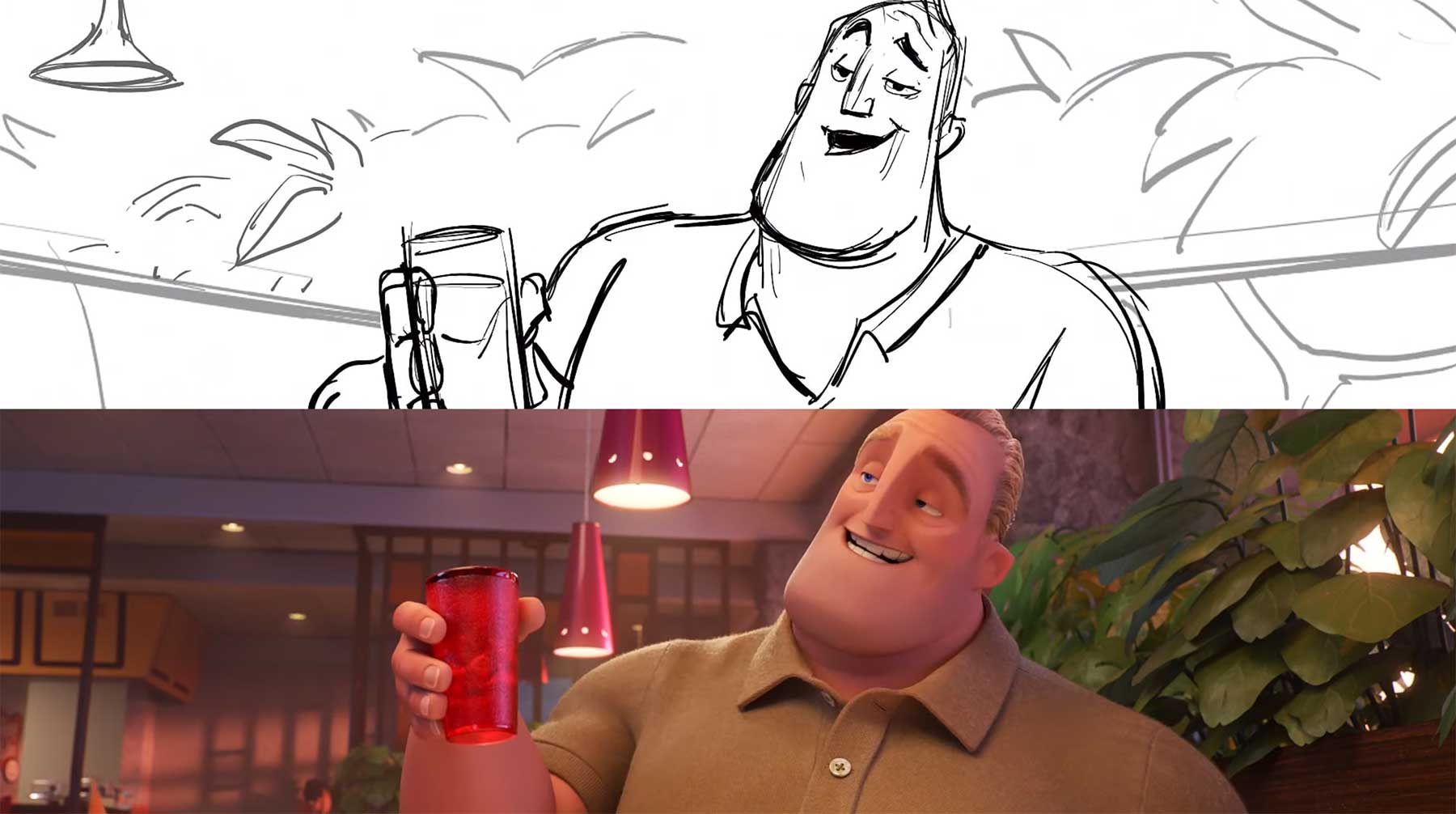 Ich glaube, ich wiederhole mich nur unnötig, wenn ich schreibe, dass ich solche Direktvergleiche zwischen Storyboard und finaler Umsetzung immer wieder interessant finde. Natürlich bieten Animationsfilme meist recht wenig Abweichungen, da alles geordnet am Rechner passiert und keine echten Darsteller on-the-spot improvisieren können. Aber dennoch ist das ein schöner kleiner Einblick hinter die kreativen Kulissen, die Disney Pixar uns mit dieser Szene aus „Die Unglaublichen“ („Incredibles 2“) zum Anlass des Heimkino-Starts (Partnerlink) veröffentlicht hat.