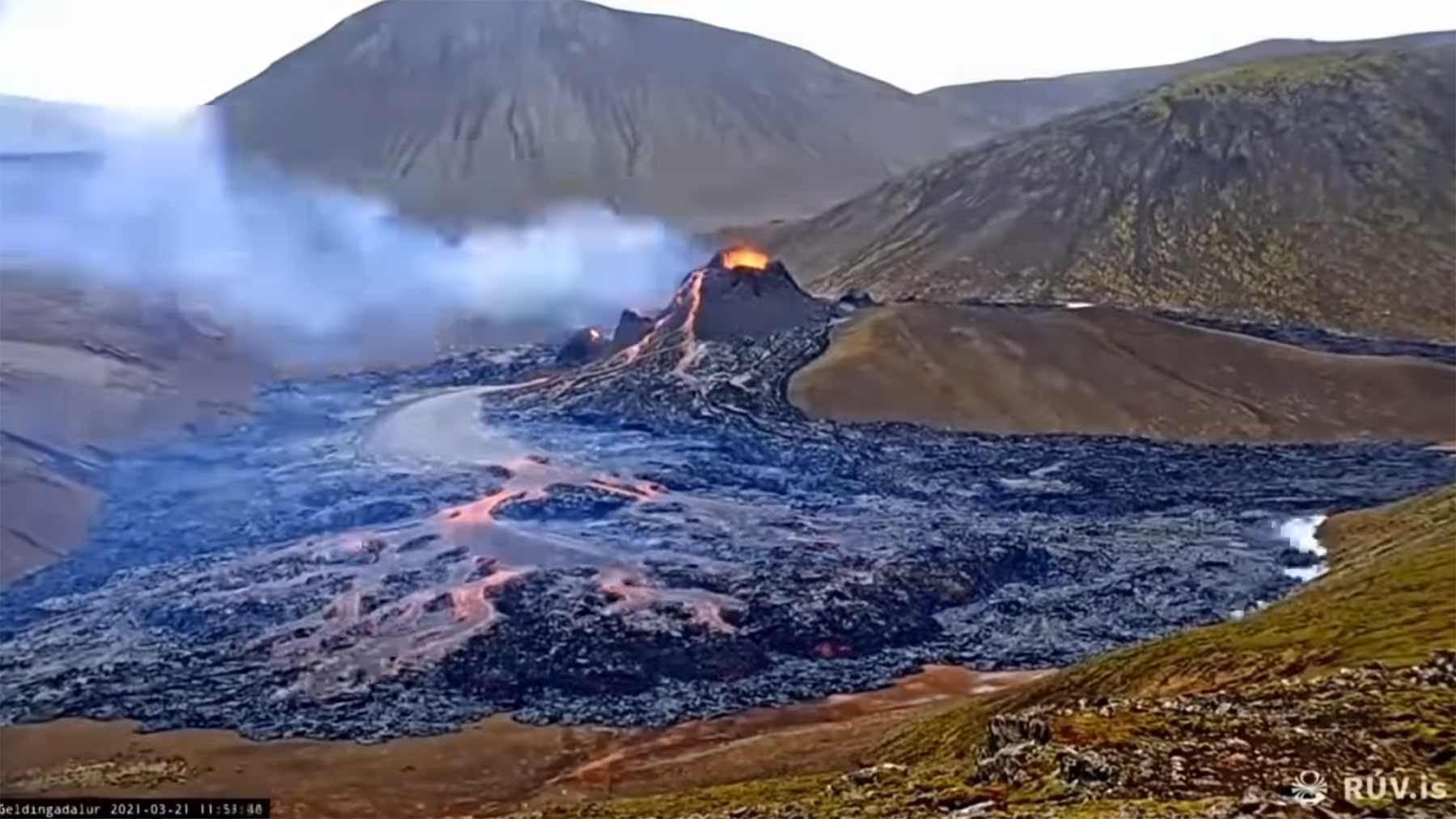 „The video was made from the Icelandic National Broadcasting Services live streams of the volcanic eruptions in Geldingadalir and on Fagradalsfjall. The first eruption started in the evening of March 19th and continues to the making of this video. The second fissure opened up on April 5th at GMT12:00 noon. The volcanic activity in the area is expected to last for quite some time, weeks, months, years and even decades.“