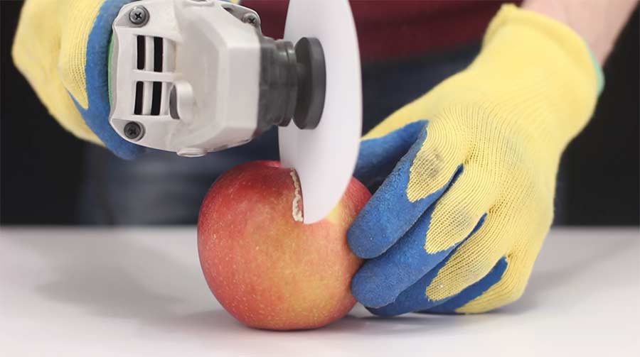 Vor gar nicht allzu langer Zeit hatte ich ein Video hier, in dem jemand mit einem Papierblatt Holz durchschnitten hat. Vielleicht ist Mr. Hacker so auf die Idee gekommen, ein kreisrundes Blatt Papier an eine Flex zu schrauben und alles zu durchschneiden, das ihm in den Weg kommt. Bis auf die Finger natürlich…