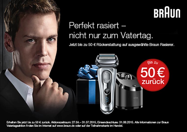 Damit Väter wie Söhne am Vatertag auch gepflegt herum laufen, hat Braun pünktlich die Cashback-Fathers Day-Aktion. Bedeutet: Auf ausgewählte Rasierer gibt es beim Kauf bis zu 50€ zurück. Vom 27. April bis 31. Juli kann man also deutlich vergünstigt sich selbst oder den Papa beschenken. Da freut sich nicht nur Sebastian.