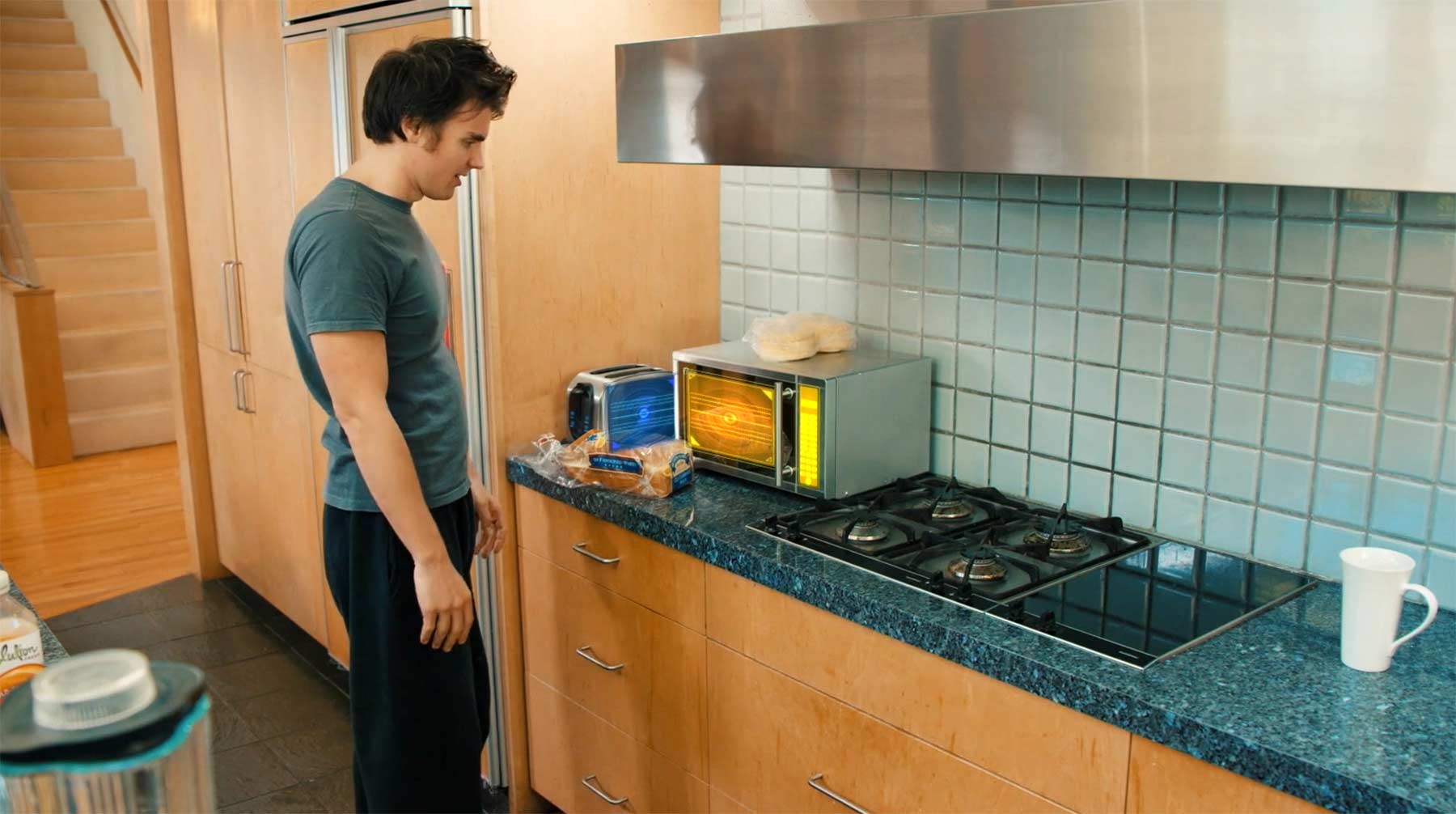 „A man struggles to make breakfast in a kitchen filled with appliances with a mind of their own.“