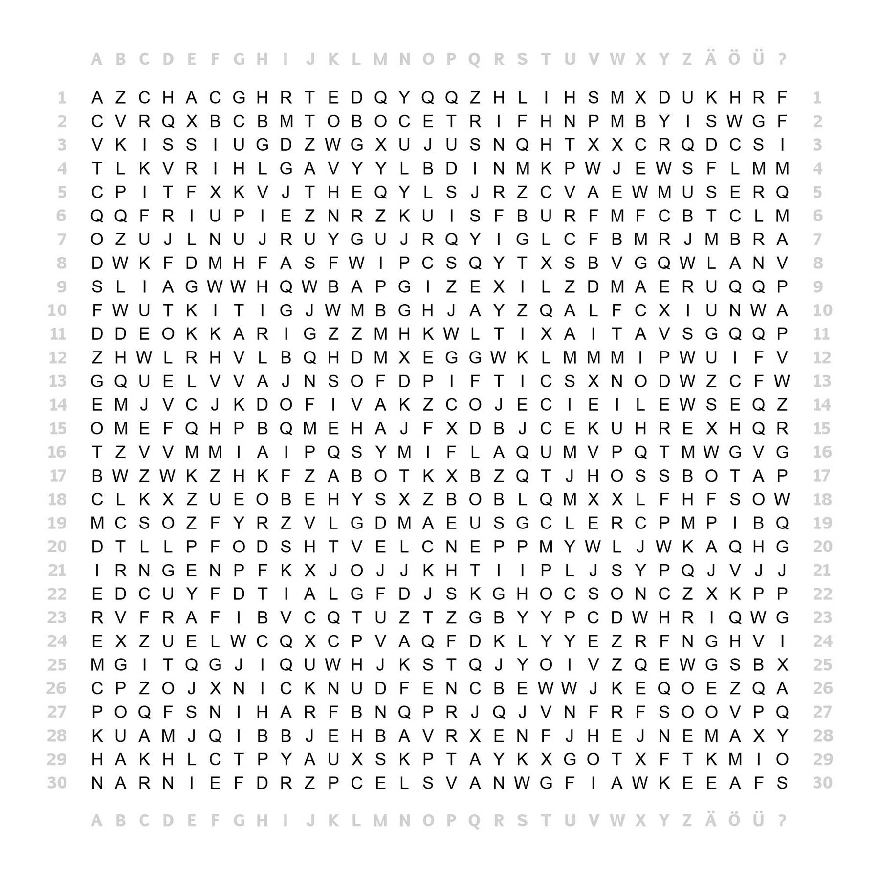 Ach ja: Nur beim ersten ist das Feld 30×30 Buchstaben groß, danach wird es „übersichtlicher“… Und als letzter Hinweis: Namen können horizontal, vertikal und diagonal versteckt sein, sind jedoch niemals rückwärts geschrieben (das wollte ich dann doch ersparen…).