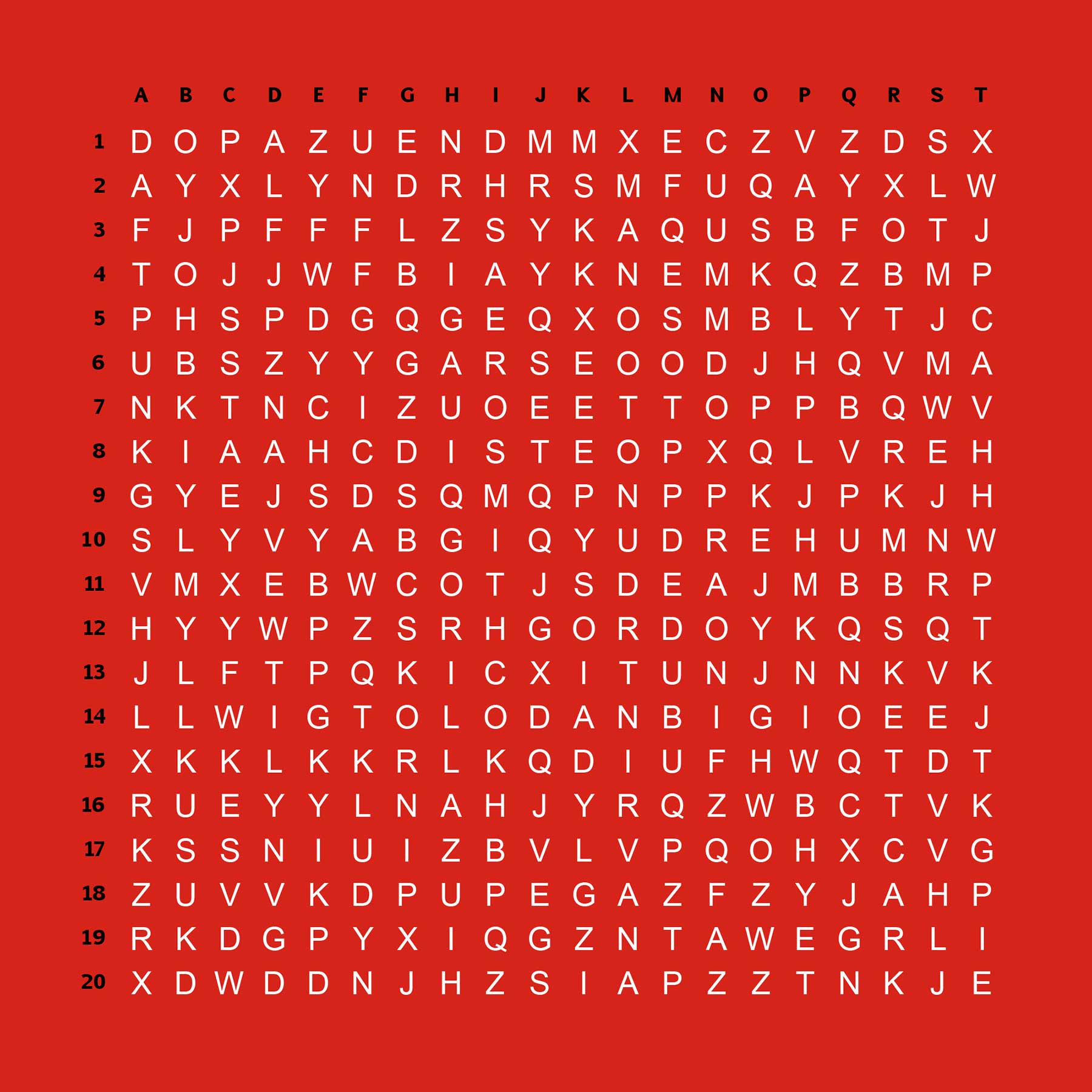 Der Clou bei meinen acht Runden: Ich habe keine Acts vorgegeben (außer bei der letzten Runde). Die Bilder haben wir als Buzzer-Runde gespielt, so dass die Ratenden per Emoticon-Meldung in Zoom anzeigen sollten, dass sie einen Musik-Act gefunden haben. Kurz die Koordinaten (Spalten-Buchstabe und Zeilen-Zahl) genannt, um den Ort anzugeben, und schon hat man eine Runde gewonnen und einen Punkt eingesackt. Ihr könnt natürlich so lange suchen, wie ihr wollt, um ggf. direkt alle zu findenden Bandnamen zu entdecken (und vielleicht mehr, wer weiß schon, ob nicht zufällig im Buchstaben-Gewimmel weitere „erbaut“ worden sind?). Pro Runde hat die Anzahl der versteckten Acts abgenommen, dafür aber die Länge der Namen zugenommen. Also, außer beim Letzten halt…