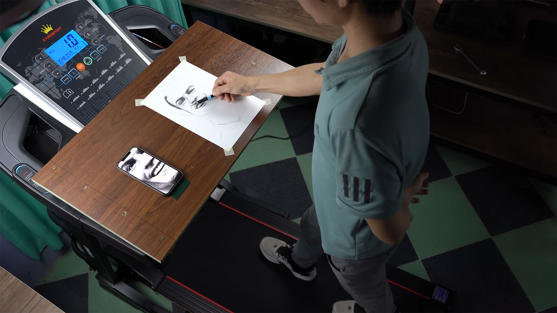 „I try to run and draw at the same time to see how it goes . but I can only draw well at . 1km/h to 4km/h . 8km/h I can’t control my pen . I did running on a treadmill and painting at the same time , This is a very difficult challenge“