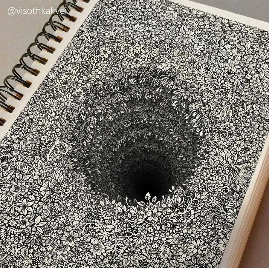 Im Notizbuch des aus Kambodscha stammenden Grafikdesigners Visoth Kakvei finden sich allerlei originelle Formen und Bildnisse. 3-6 Stunden braucht er für die einzelnen Motive, die zwischen analoger Perspektivzeichnung und offenkundiger Nachbearbeitung hin und her wechseln. So fragt man sich zwischenzeitlich immer, was nun wirklich so gezeichnet und was am Computer generiert wurde.