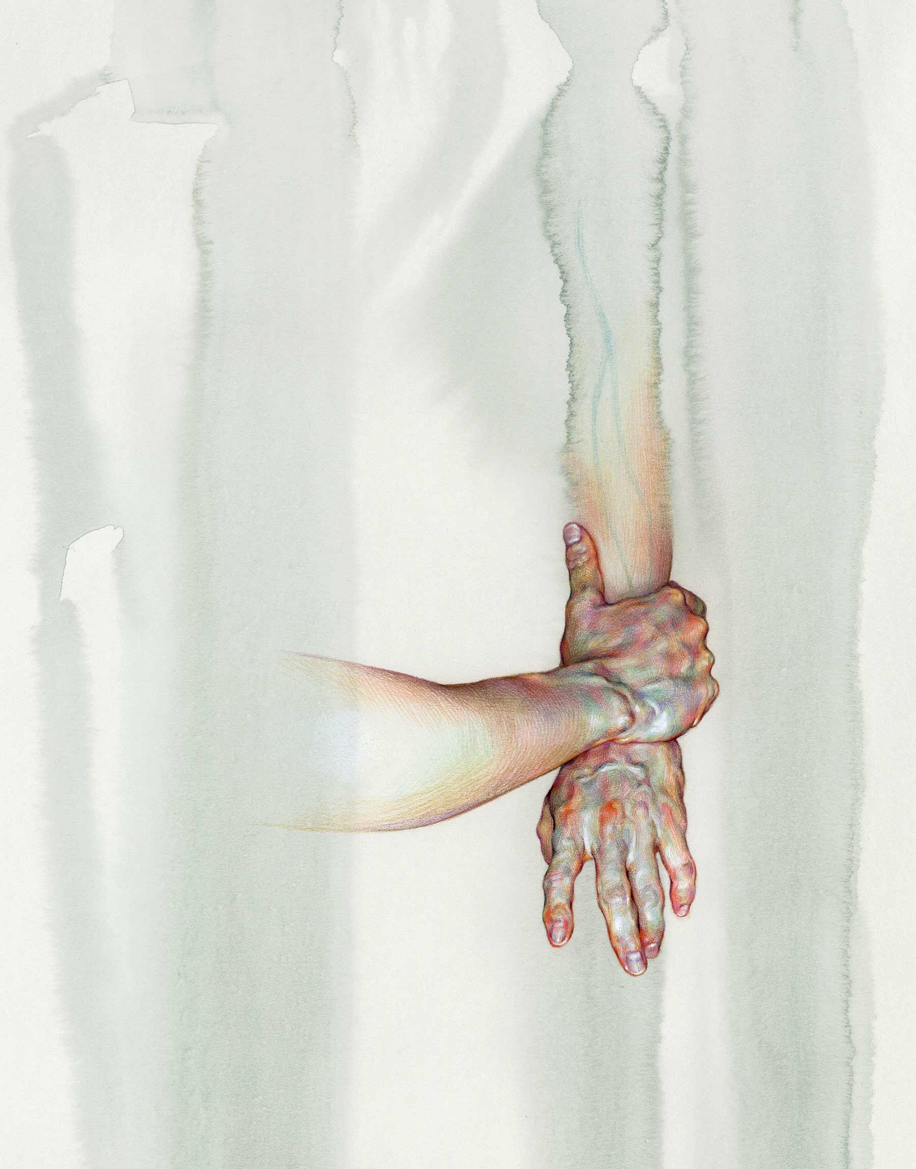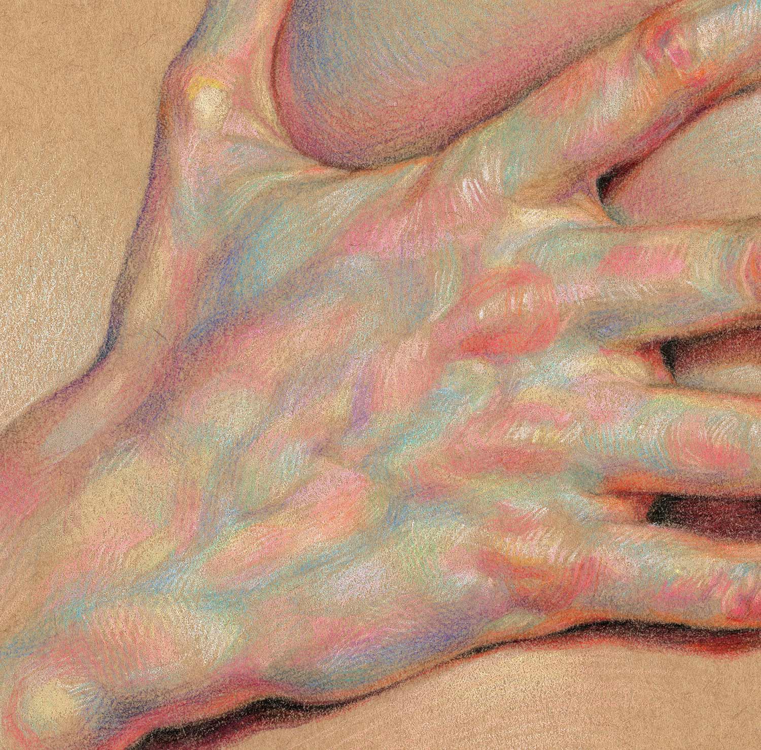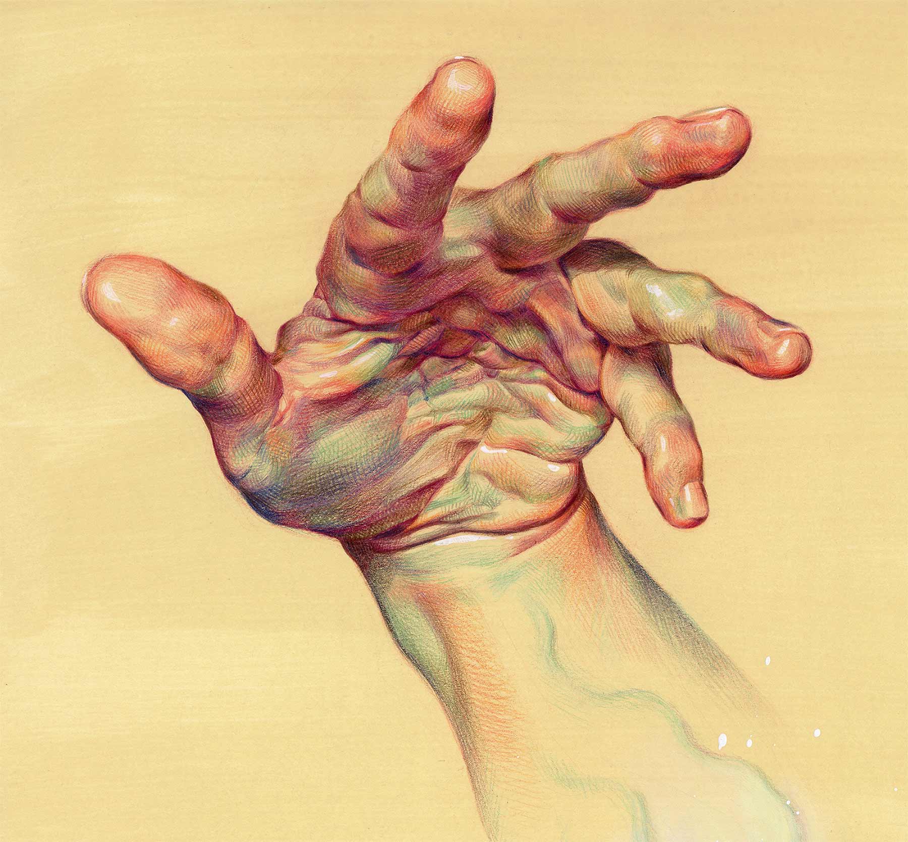 Es ist erstaunlich, welchen Eindruck von Realitätsgrad WanJim Gim mit seinen so offenkundig künstlichen Bildern erschafft. Nicht nur bekommen wir meist nur einzelne Körperteile zu sehen, die langsam im Nichts des Papiers verblassend verschwinden, nein, die bunte Schraffur der Buntstift-Striche schreit eigentlich nach „abstrakt“. Aber nein, dank gekonnter Akzentuierung und vor allem Schattierung erhalten die Finger und Knöchel einen hervorragenden räumlichen Effekt und die Anatomie wird sehr detailgetreu dargestellt. Eine tolle Technik des Südkoreaners, die wunderschön aussieht.