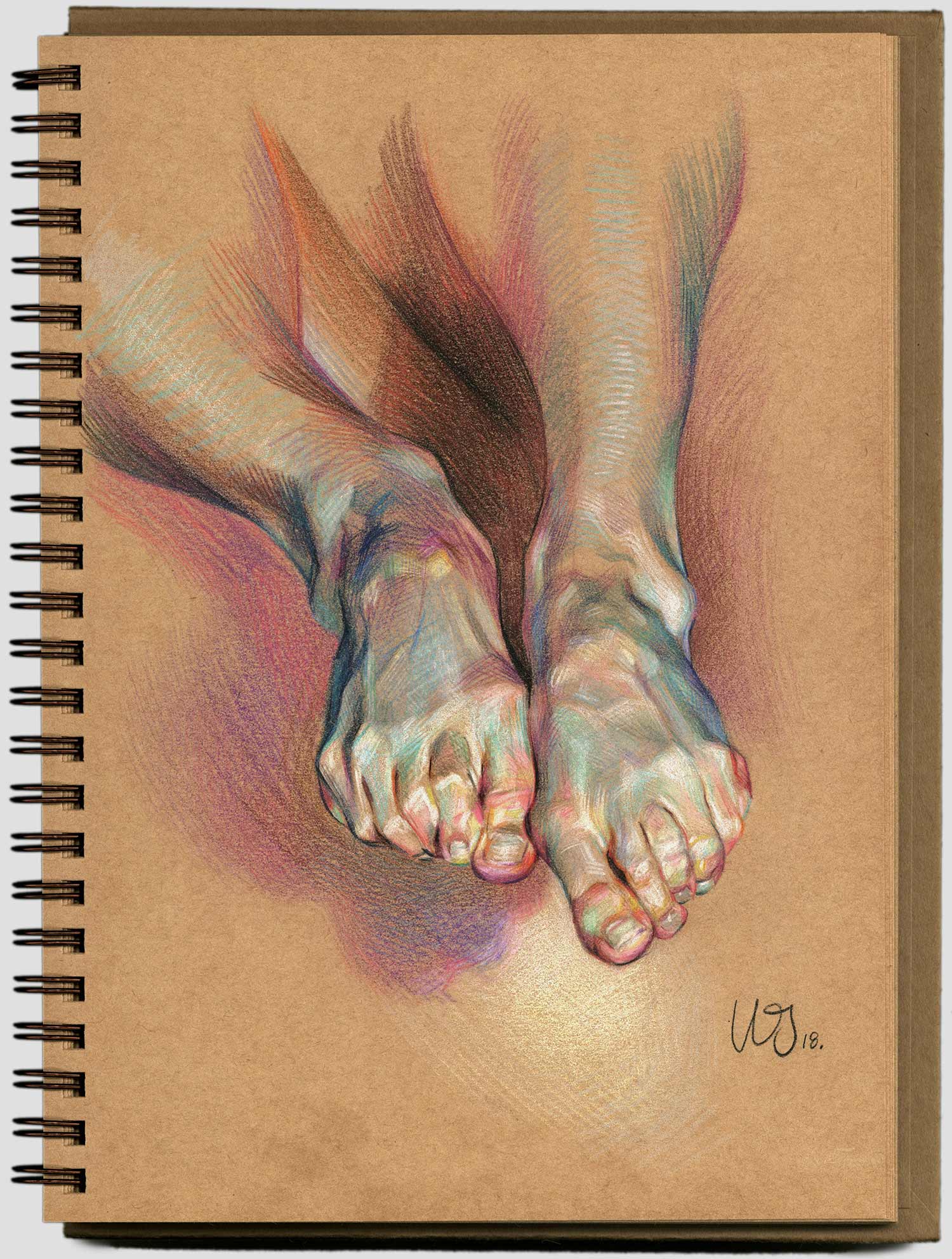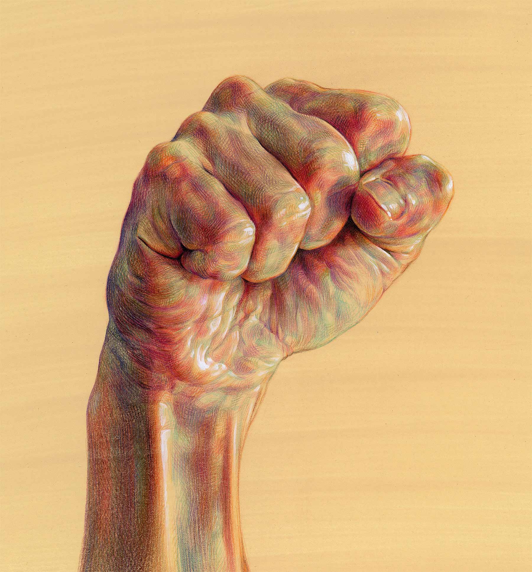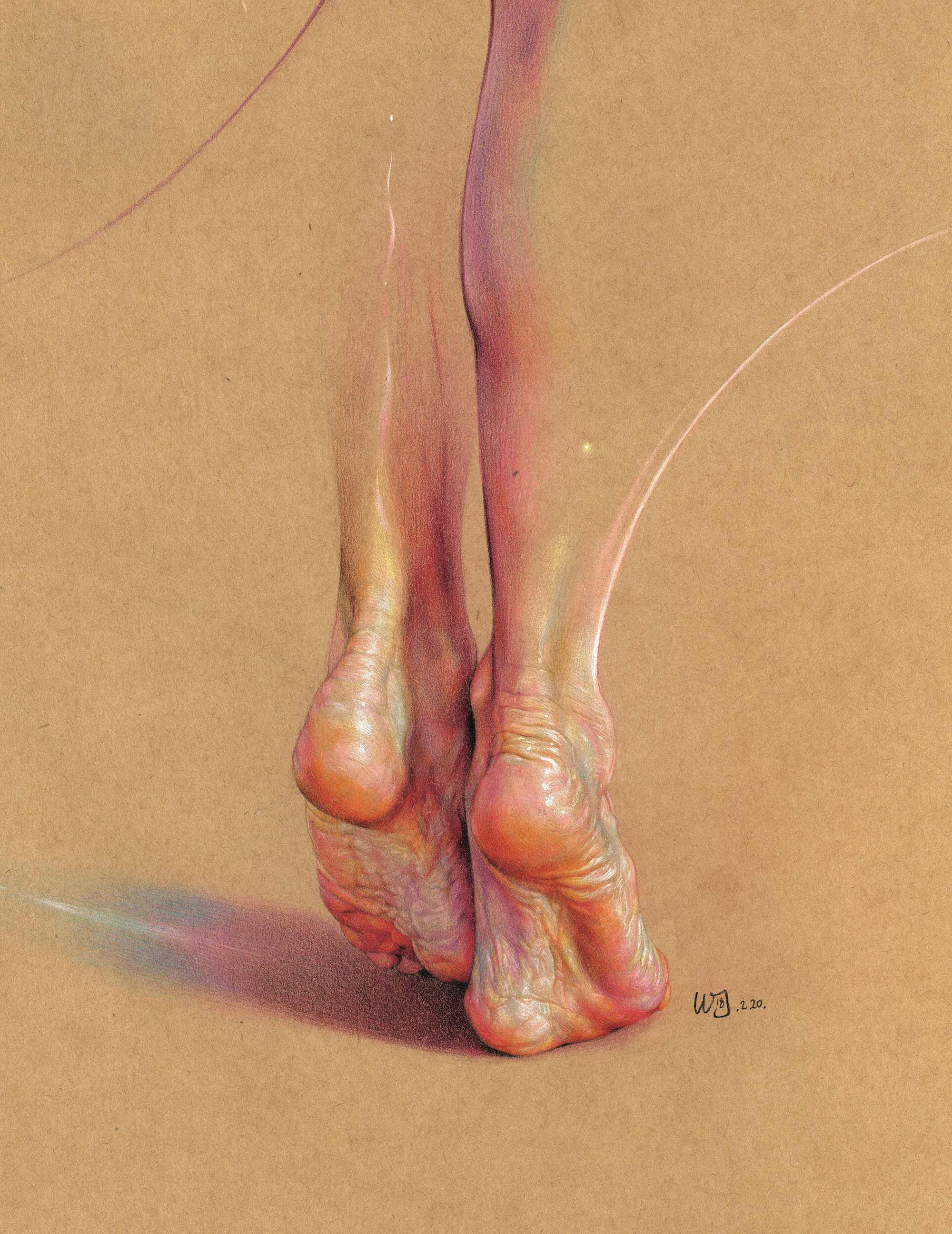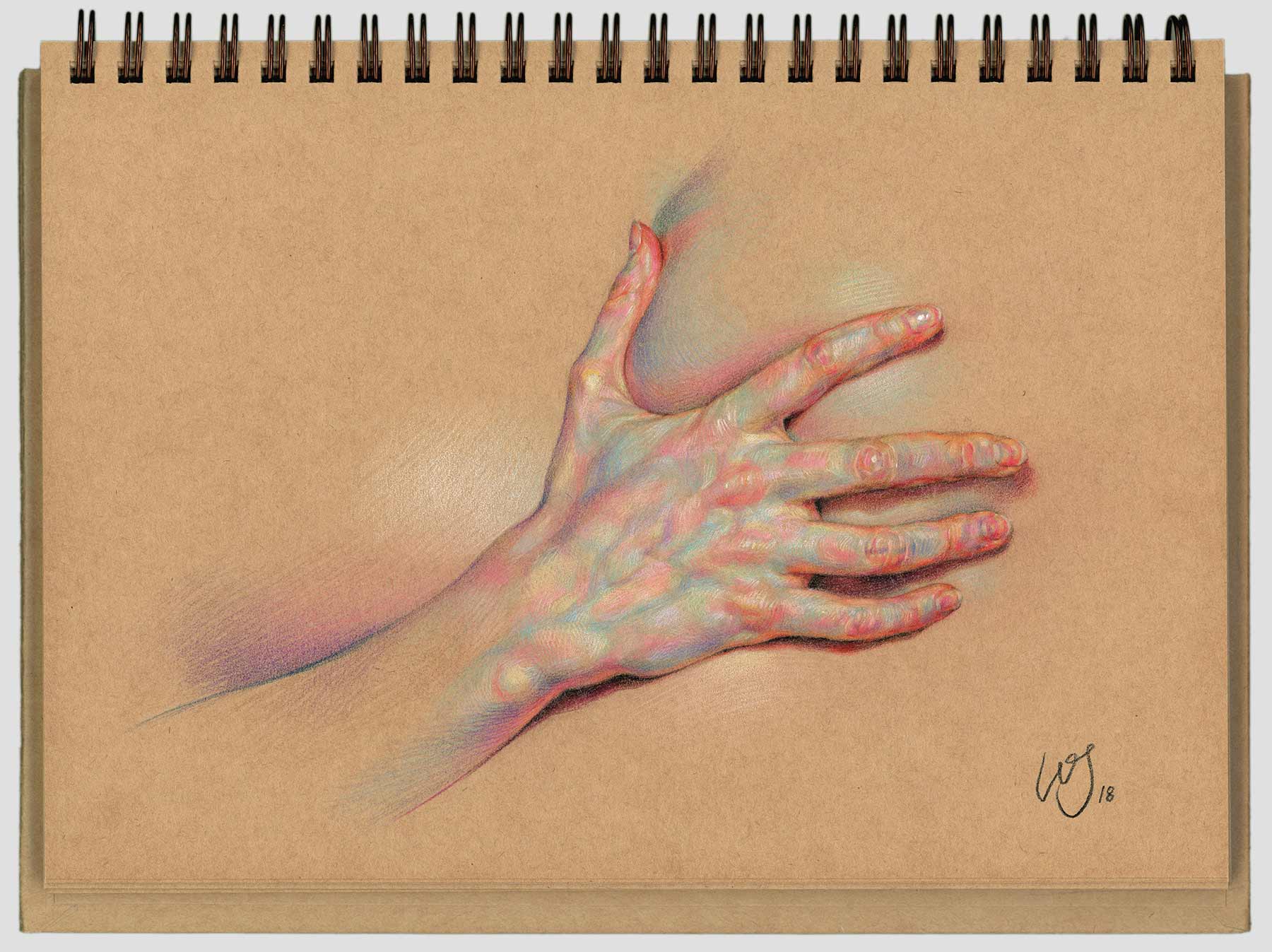 Es ist erstaunlich, welchen Eindruck von Realitätsgrad WanJim Gim mit seinen so offenkundig künstlichen Bildern erschafft. Nicht nur bekommen wir meist nur einzelne Körperteile zu sehen, die langsam im Nichts des Papiers verblassend verschwinden, nein, die bunte Schraffur der Buntstift-Striche schreit eigentlich nach „abstrakt“. Aber nein, dank gekonnter Akzentuierung und vor allem Schattierung erhalten die Finger und Knöchel einen hervorragenden räumlichen Effekt und die Anatomie wird sehr detailgetreu dargestellt. Eine tolle Technik des Südkoreaners, die wunderschön aussieht.