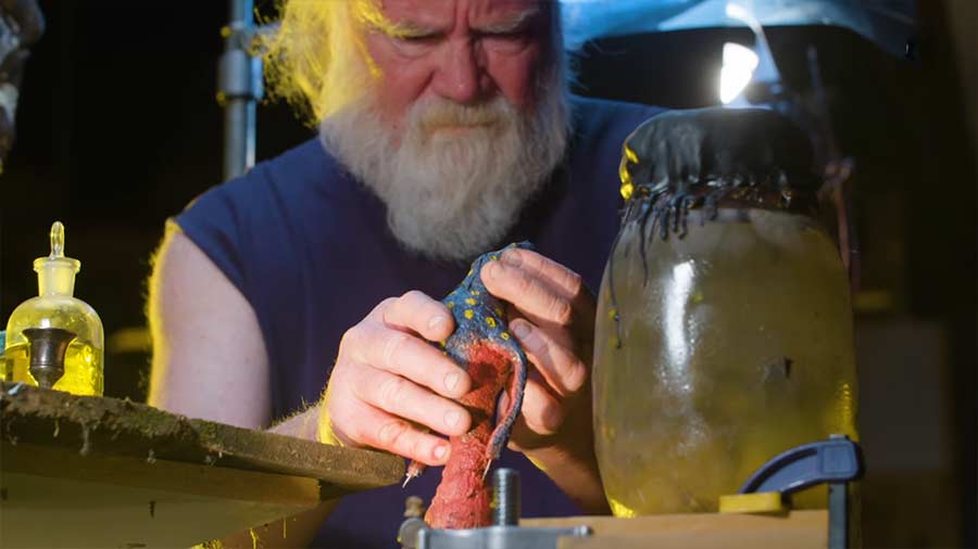 „For over 30 years, Tippett has been working on an incredibly detailed film called ‚Mad God‘. He describes it as being set ‚in a Milton-esque world of monsters, mad scientists and war pigs.‘ Amazingly, each character is painstakingly constructed by hand from foam, clay, latex and wire. Despite all the arduous toil, Tippett sees „Mad God“ as a form of therapy and a way to reconnect with a time when special effects and animation were all done by hand.“