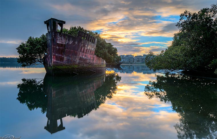 1911 wurde das 1.190 Tonnen schwere Stahlmonster erbaut. Seit 1972 liegt es im Homebush Bay, einer Art Ruhestätte für ausgediente Schiffe im australischen Sydney. Und obwohl um es herum Industrieabfälle nur so wimmeln, hat sich auf der SS Ayrfield eine Art kleines Biotop entwickelt. Ein schwimmender Wald. Toll!