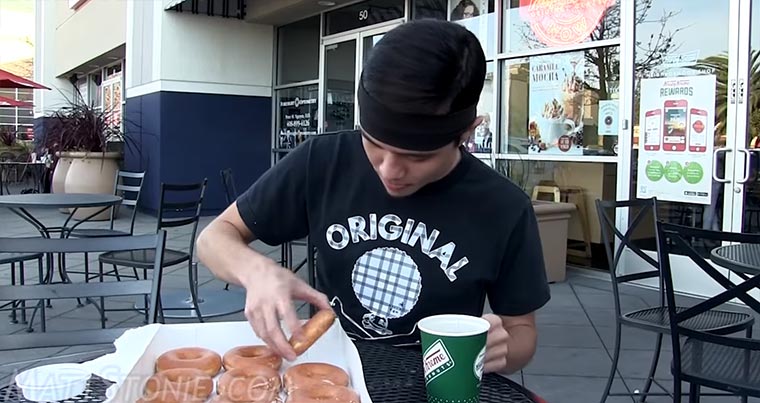 „Simple challenge today! One Dozen Krispy Kreme Doughnuts, as fast as you can. To my best knowledge the time to beat was 45 second.“