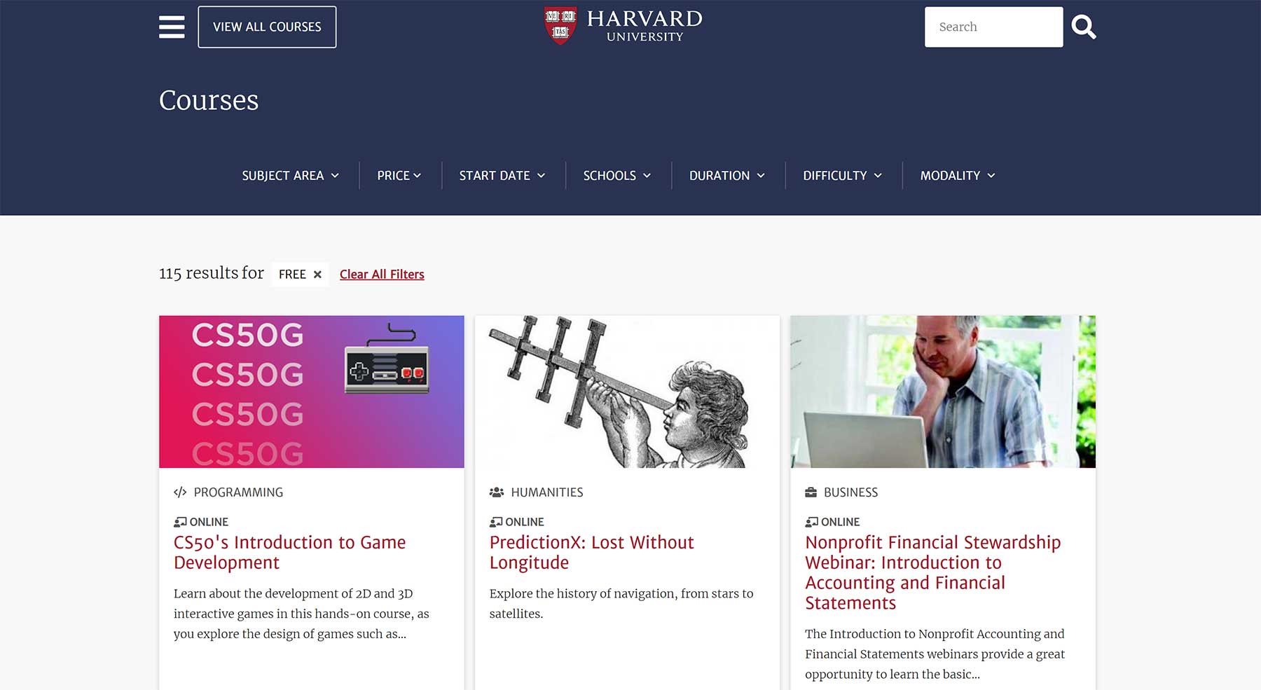 Das ist auch an der Harvard Universität so – allerdings gibt es dort einige kostenlose Kurse im Online-Lernportal zu finden! Aktuell sind das 115 aus den unterschiedlichsten Lernbereichen. Mal „nur“ ein 15-Minuten-Einleitungsvideo, mal ein länger aufgebauter über mehrere Wochen laufender Online-Kurs mit ordentlich Material. Manchmal ist nicht alles komplett kostenlos, teilweise Inhalte schon aber für ein offizielles Zertifikat muss man extra zahlen. Letztlich zählt aber, dass ihr hier einiges an geprüftem Lehrmaterial einsehen könnt, das gratis euer Wissen und euren Horizont erweitert. Zumal Basis-Einleitungen auch wunderbar sind, um feststellen zu können, ob einen gewisse Themen auch wirklich interessieren, um dann mehr Zeit und ggf. Geld in sie zu investieren.