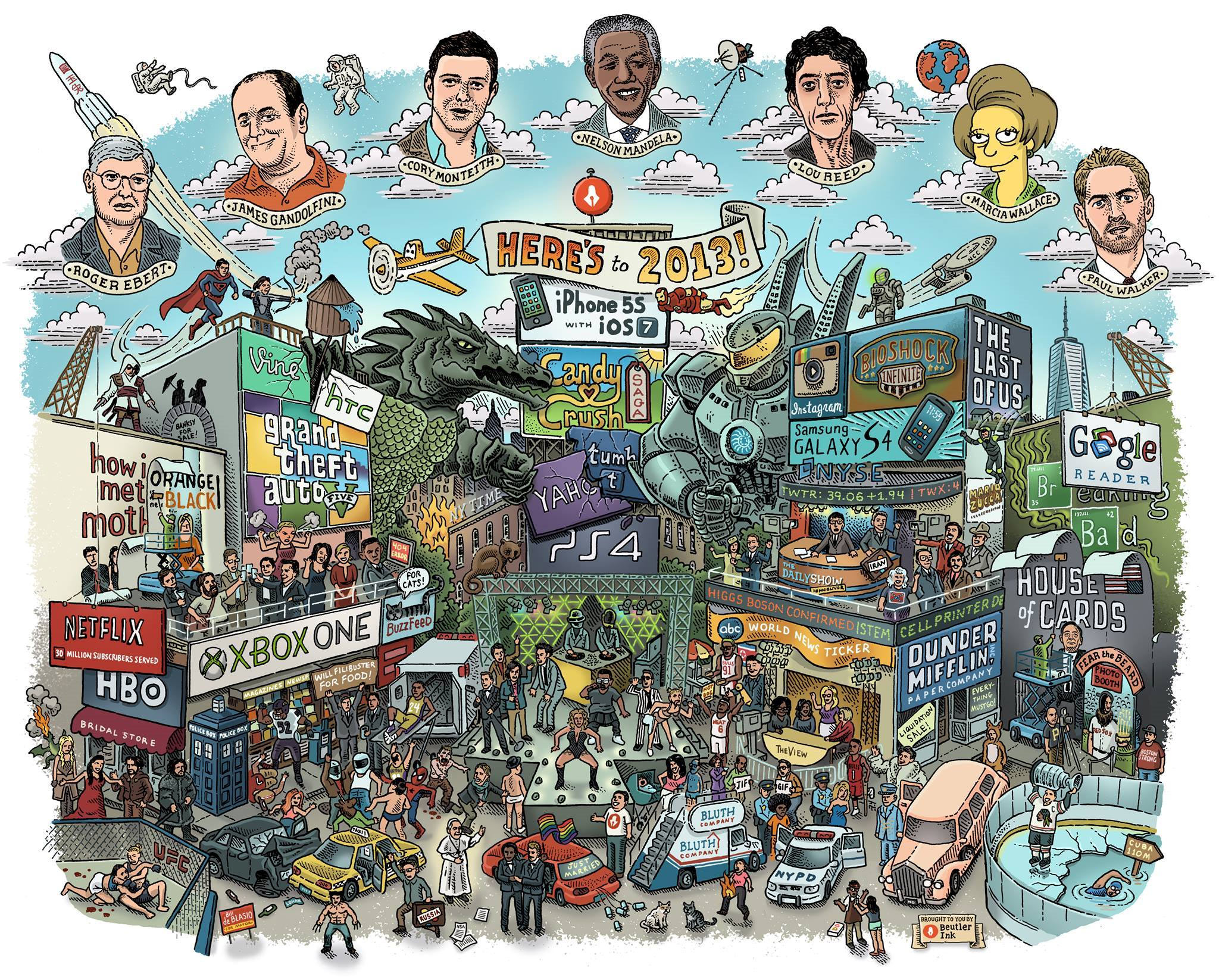 2013 ist viel passiert. Das wird ja bereits seit November in diversen Jahresrückblicken aufgearbeitet. Eine schöne Form der Aufbereitung hat Beutler Ink gefunden, die eine immense Illustration erstellt haben, die das komplette Jahr 2013 in sich vereint. „Komplett“ aus Sicht der Vereinigten Staaten natürlich, Dinge wie die Rückkehr der Bilderparade oder das Jubiläum der WIN Compilation fehlen vollkommen…