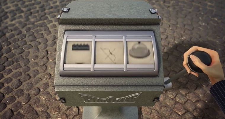Der Plot-O-Mat ist eine nützliche technische Innovation, die das Geschichtenmachen revolutionieren wird. Einfach an einem Hebel ziehen und heraus kommen drei Kernelemente für den Plot einer einzigartigen Geschichte. So wie bei diesem Beispiel hier.