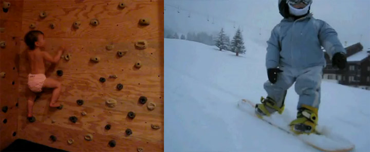 Okay, ganz so gut können sie es vielleicht nicht. Und dennoch sind diese Aufnahmen mehr als bemerkenswert. Zunächst ein 22 Monate altes Mädchen, das an der Kletterwand die Spielsachen herunter holt und sicherlich von keinem Laufstall der Welt aufgehalten werden kann. Danach der gleichaltrige Emile in seinem ersten Winterurlaub auf dem Snowboard. Klar, keine Backflips und Rekordzeiten zu verbuchen, aber für das Alter: Not bad!
