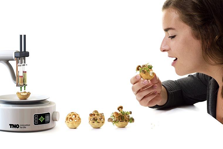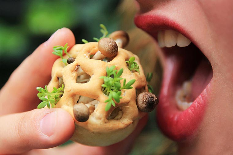 Essbare Erdsubstanz, Samen und Mineralien sorgen dafür, dass binnen fünf Tagen ein kleines essbares Biotop entsteht. Pilze, Kräuter und eine brotähnliche Umfassung sollen den Snack der Zukunft darstellen. So zumindest der Gedanke der Eindhovenerin. Denn noch handelt es sich hierbei um ein Konzept. Mit Zuckerstoffen oder Schokolade wird jedoch tatsächlich bereits gedruckt.