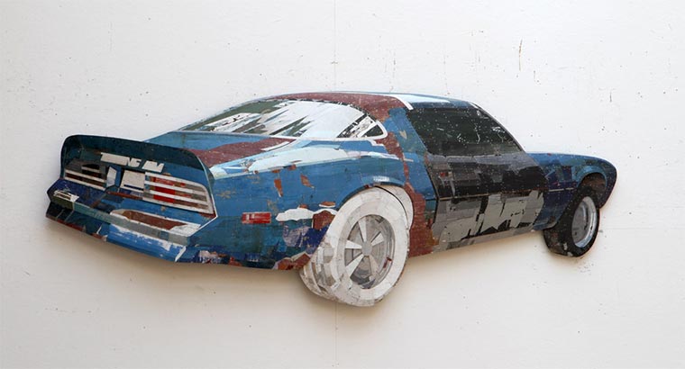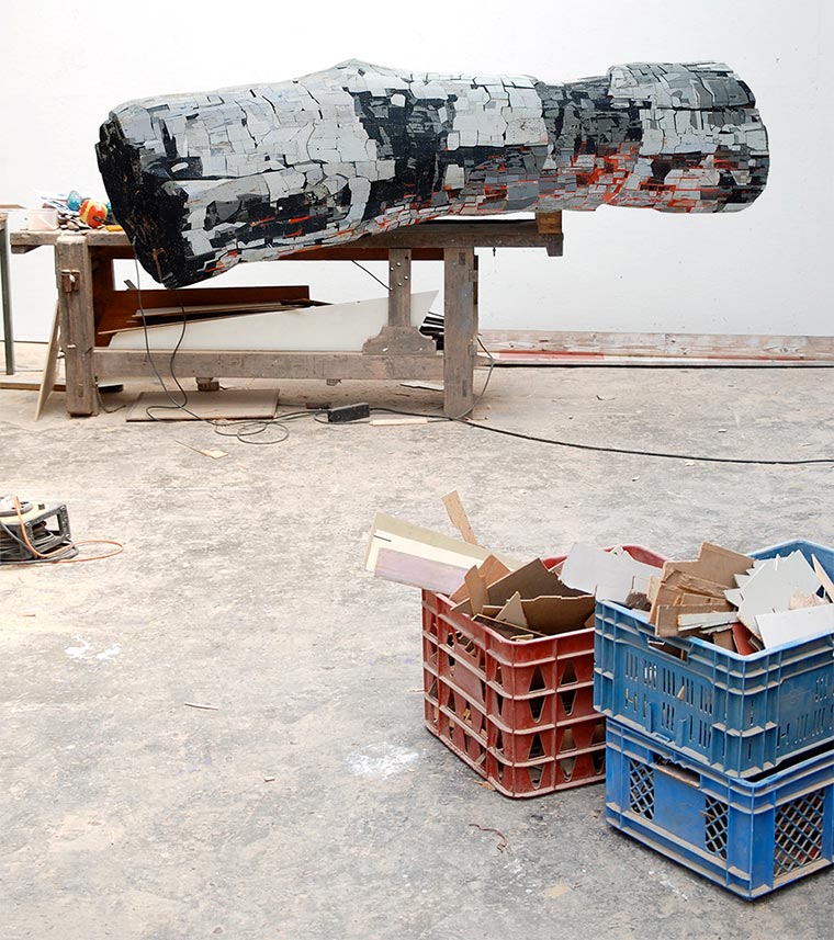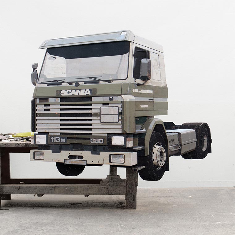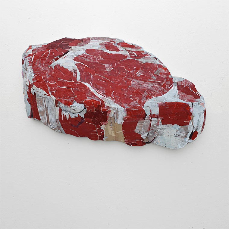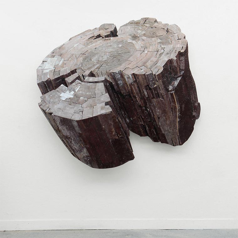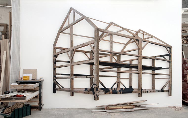 Handwerklich gut gemachte Hütte da oben, oder? Auch wenn so etwas aus Zimmermanns-Sicht schon nicht verkehrt wäre – das ist eigentlich nur eine Holzplatte. Das ist schwer zu umschreiben, aber eigentlich schneidet und setzt der niederländische Künstler Ron van der Ende lediglich einzelne Stücke Holz zusammen – so, wie er sie farblich findet. Bei Betrachtung unter passender Perspektive schaut es aber verdammt nochmal aus wie ein dreidimensionales Objekt. Drei Maße hat dieses Werk auch: 410 x 327 x 22cm.