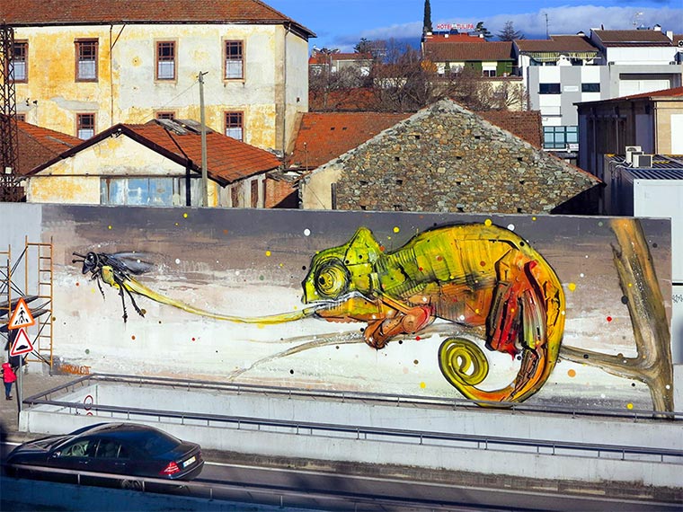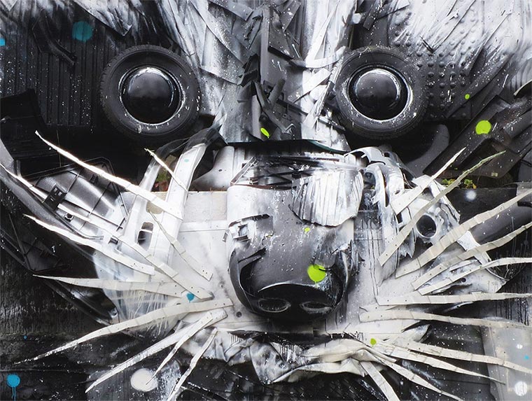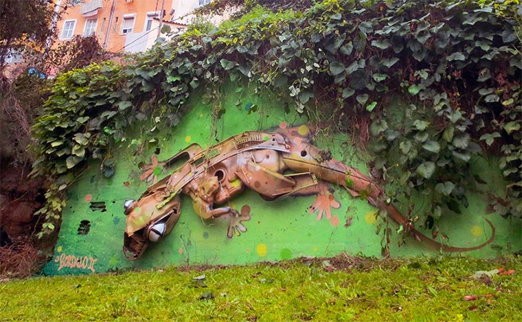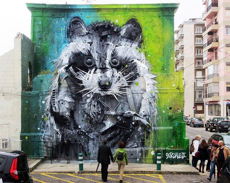 Damit seine Werke auch richtig ins Auge stechen, bedient sich Street Artist Bordalo II einer simplen aber nicht einfachen Technik: Abfall. Alte Reifen, Plastikmüll und Metallschrott verarbeitet er gekonnt zu dreidimensionalen Bestandteilen seiner Wandmotive. Passend angemalt merkt man es aus der Ferne erst, wenn plötzlich das Bild über die Wandfläche hinaus weiter geht. Toll!